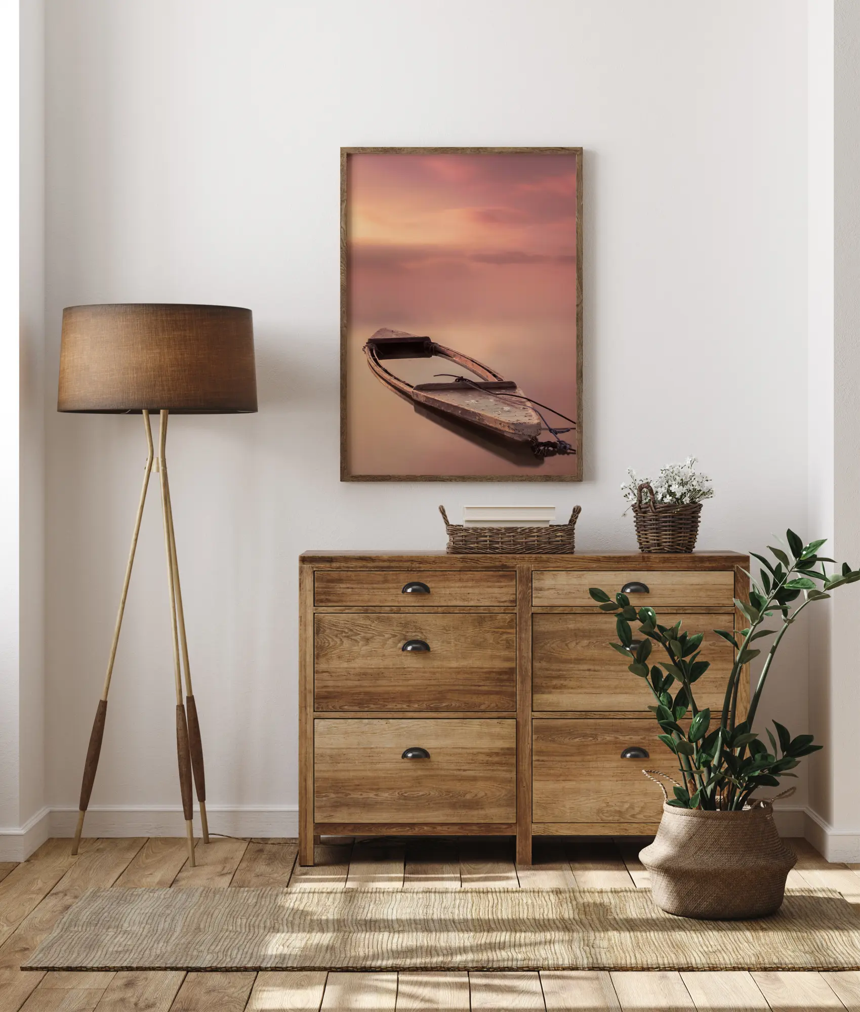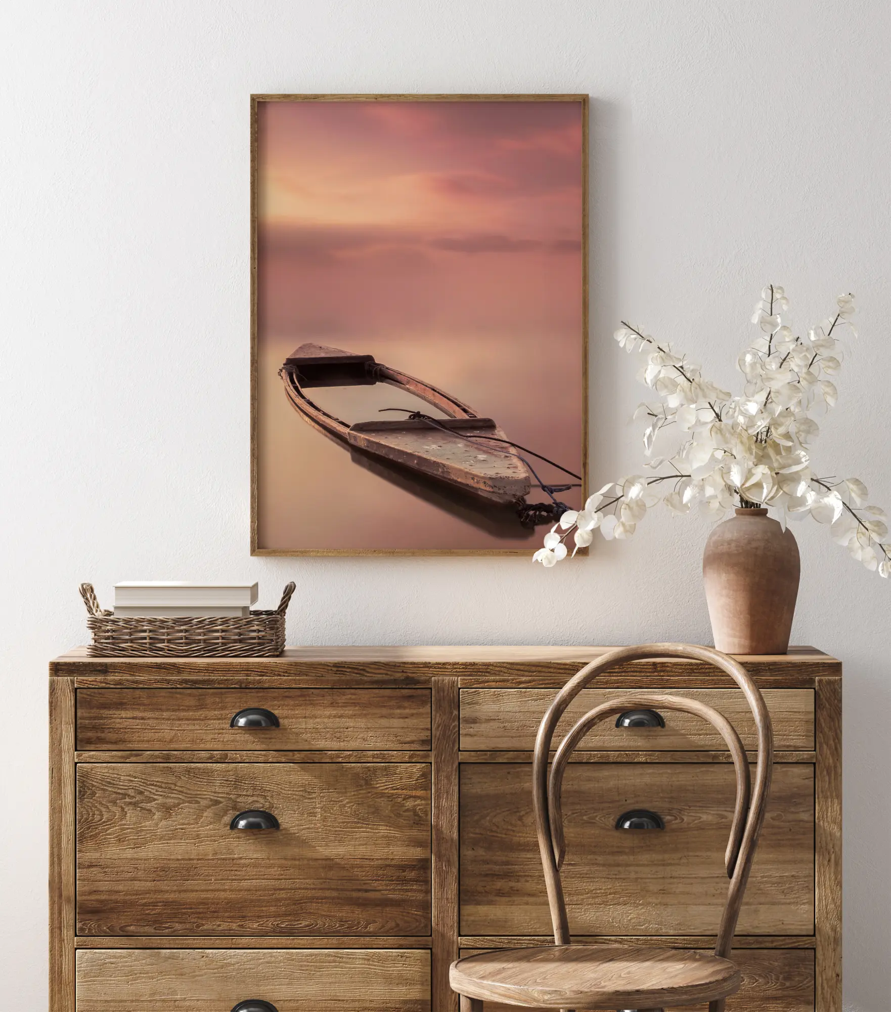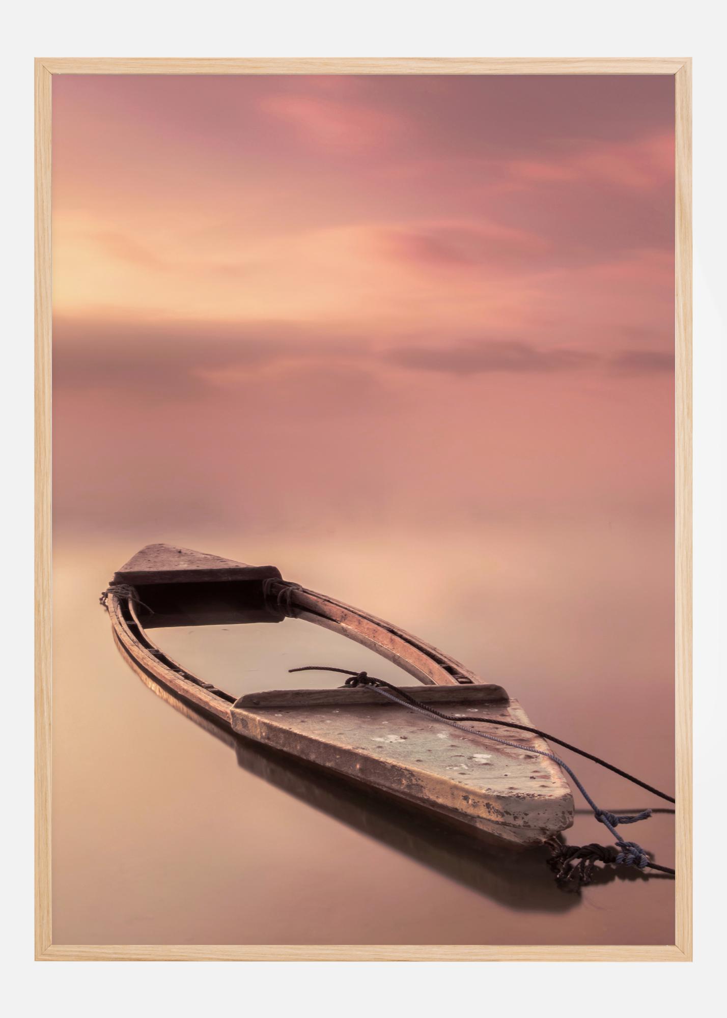 Rahulik plakat puust paadiga, mis lebab vaiksel veel. Vesi ja taevas on pehmetes roosades ja lillades pastelltoonides. Need sulanduvad üksteisesse ja panevad vee ja taeva kokku sulama ning igavesti jätkuma. Paad on ainus kindel objekt, mis on selle pehme, rahustava pildi fookuspunkt.