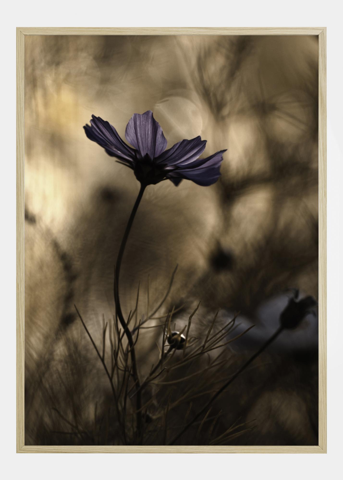 Lillelise lillega lilled plakat, mis õõtsub vastu pehmet pruuni tausta. Lillad kroonlehed on dramaatiliselt esile toodud uduste taimede taustal. Teised vormid ilmuvad, kui pilk liigub piki kaardus varsi, et kogu pilti sisse võtta.
