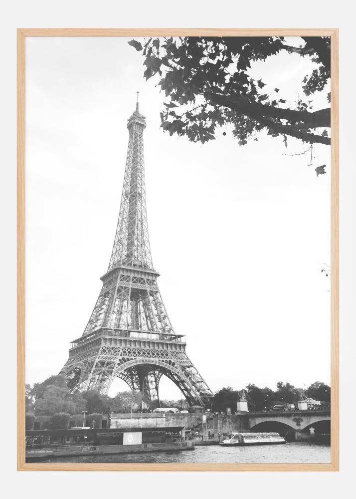 Linnaposter Eiffeli torniga Pariisis. Hall torn on selgelt nähtav valge taeva taustal. Allpool on näha jõe elu ja liikumist paadi ja sillaga. Puuharu varjab peaaegu torni tippu selles ikoonilise monumendi lihtsas, loomulikus pildis.