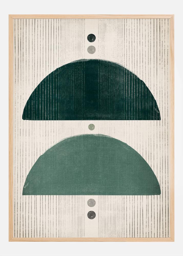 See plakat on rohkem kui lihtsalt dekoratiivne pilt; see on kaasaegne kunstiline tõlgendus, mis ühendab loomuliku ja stiliseeritud. Kolm ringikujulist vormi, mis on paigutatud poolringikujuliste plokkide vahele, toimivad fookuspunktina, mis ühendab kogu kompositsiooni. See prinditud plakat võiks olla elegantne seinadekoratsioon minimalistlikus kodus või kontoris, ja rahulikud rohelised toonid lisaksid looduse ja rahu tunnet mis tahes keskkonda.