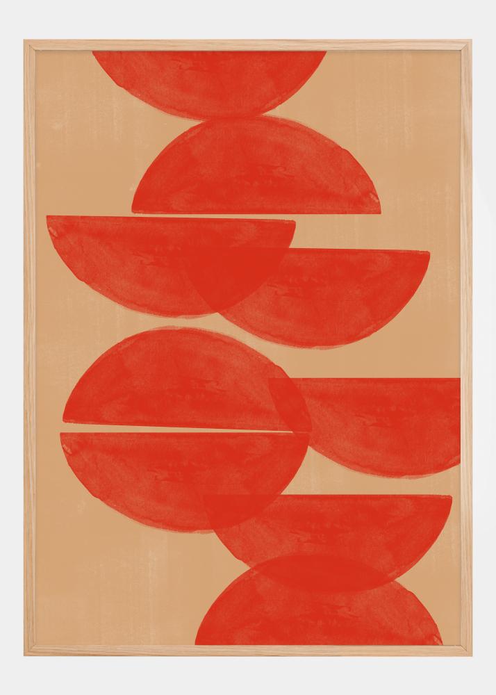 See elav ja köitev plakat kujutab endast julget väljendust oma kattuvate poolringidega sügavas, punakasoranžis paletis. Teema, mis on oma olemuselt geomeetriline, kordab poolringe peaaegu rütmilises järjekorras, luues liikumise ja dünaamika tunde rahustaval beežil taustal. See on trükk, mis pakub kaasaegset puudutust ja energilist fookust igasse ruumi, kuhu see paigutatakse.