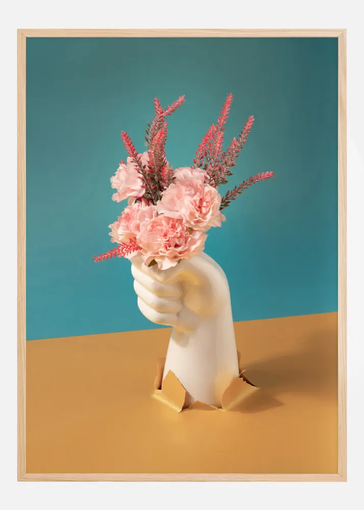 See loominguline ja leidlik plakat kujutab skulpturaalset kätt, mis hoiab kimp õitsevaid lilli, luues illusiooni vaasist. Rahulikes sinistes toonides taust kontrastib kaunilt soojade kollaste ja roosade värvidega, luues värske ja kaasaegse tunde. Käe jagatud kompositsioon, mis murrab läbi kollase pinna, lisab pildile dünaamika ja kolmemõõtmelise illusiooni elemendi.