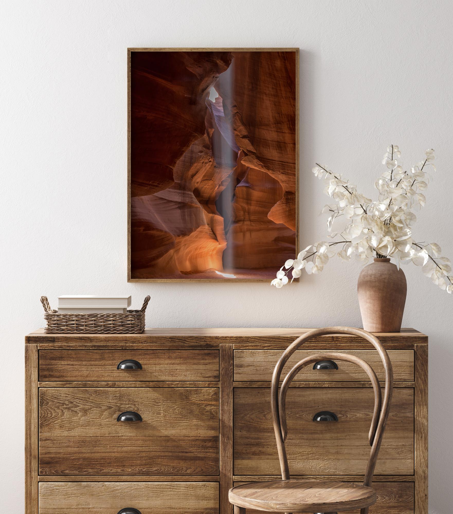 Maagiline poster, millel on valguskiir, mis liigub alla punaste kaljude vahelt. Punaste kaljude pehmed kumerused loovad sooja sära. Ainus valguskiir annab sellele suletud ruumile maagilise atmosfääri ja valgustab veelgi pehmeid kaljusid. Võtke see teos endaga koju kaasa, et pakkuda oma kodule dramaatilist täiendust.