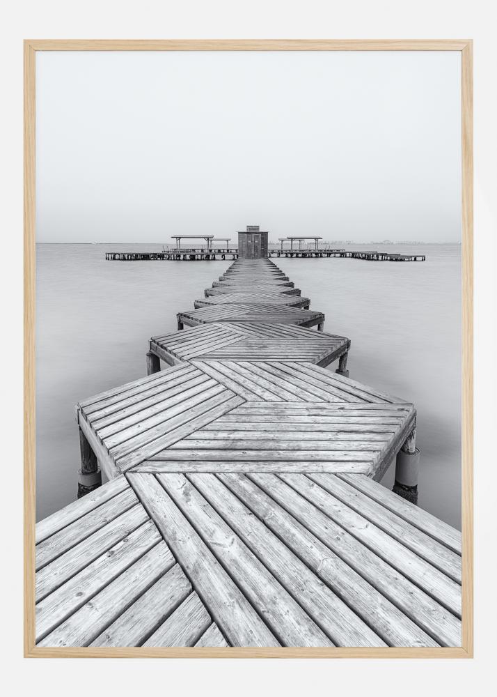 Lõbus plakat kuusnurksest kai, mis viib kaugele üle vaikse järve. Pilt on summutatud hallides toonides, mistõttu tundub see pigem külm kui soe. Puidust kai viib sind kaugusse, kus sind ootab sild. Kombineeri heleda värviga, et lisada soojust.