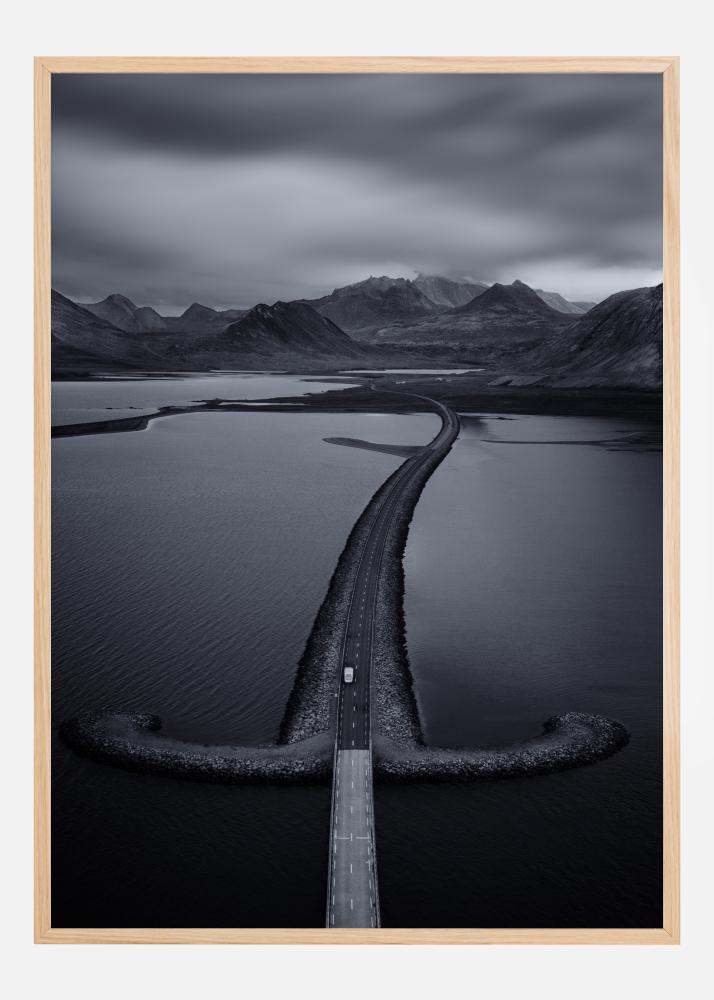 Poster halltoonides, millel on lai tee, mis kulgeb järvede vahel ja mägede taustal. Hall pilvine taevas ripub ülal. Ainus valge auto sõidab mööda teed kauguste poole. Kombineeri heleda seinaga, et anda sellele rangesle pildile veidi värvi.