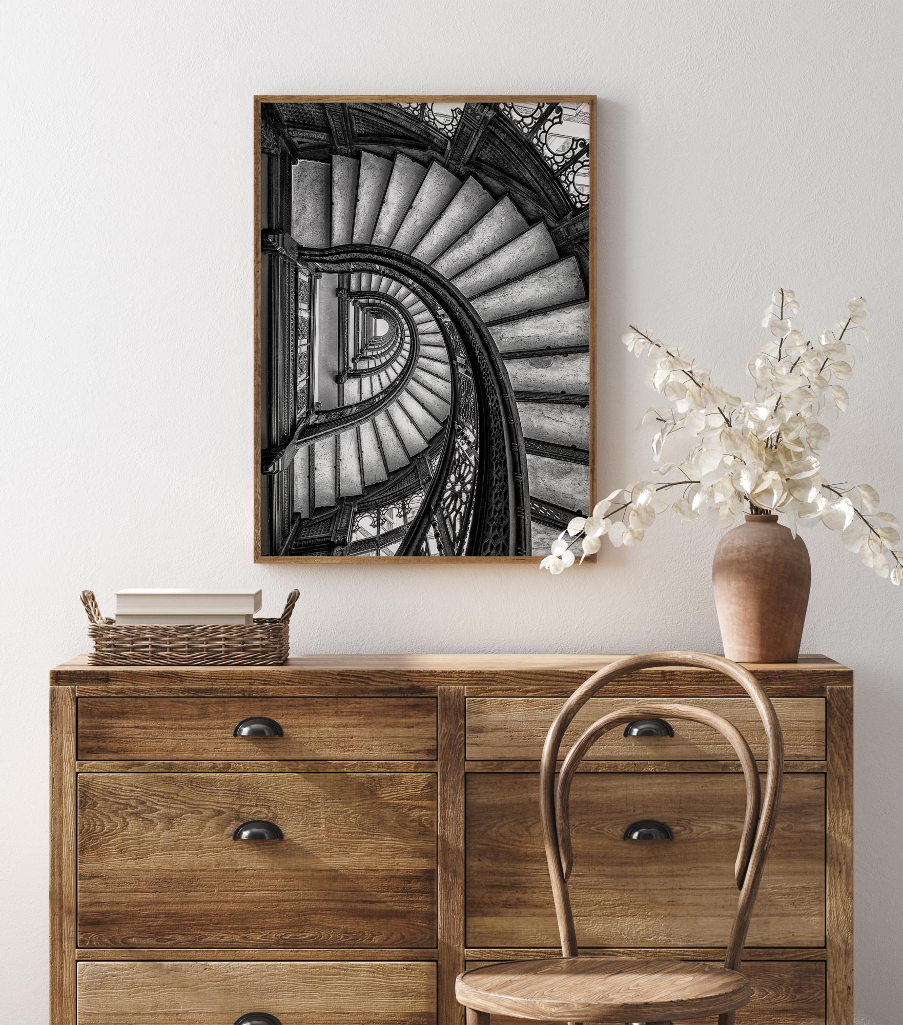 Interjööri plakat, millel on kujutatud spiraaltreppide seeria, mis lookleb hoone põhja poole. Ülalt vaadates keerlevad trepid ringi. Sepistatud rauast käsipuud on detailsed ja paistavad silma lihtsate trepiastmete taustal. Kontrastselt toonid annavad teosele sügavust, kui pilk tõmmatakse alla põhja poole.