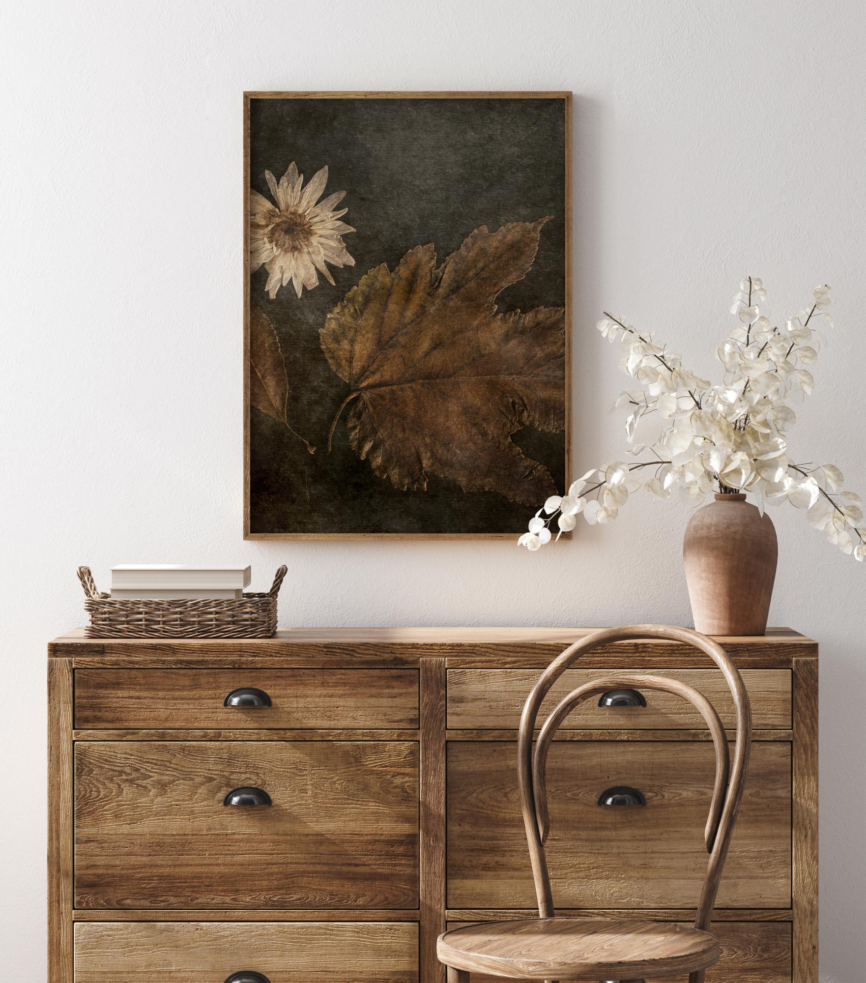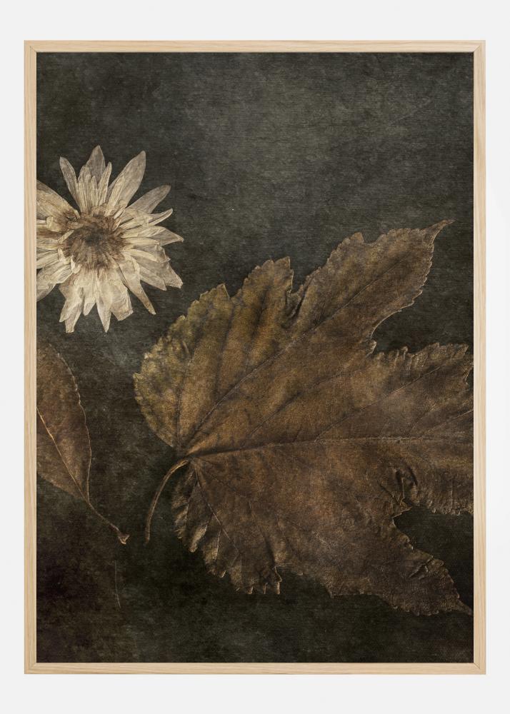 Lilleline plakat koos lihtsa lille ja kahe lehega. Valge tähekujuline lill köidab pilku, kui see torkab silma tumedahalli tausta vastu. Kaks pruuni sügislehte raamivad seda, üks lihtne ovaalne ja teine keerukam viigipuu leht. Vaadake hoolikalt, et märgata lehtede ja kroonlehtede detaile selles suurepärases botaanilises trükis.