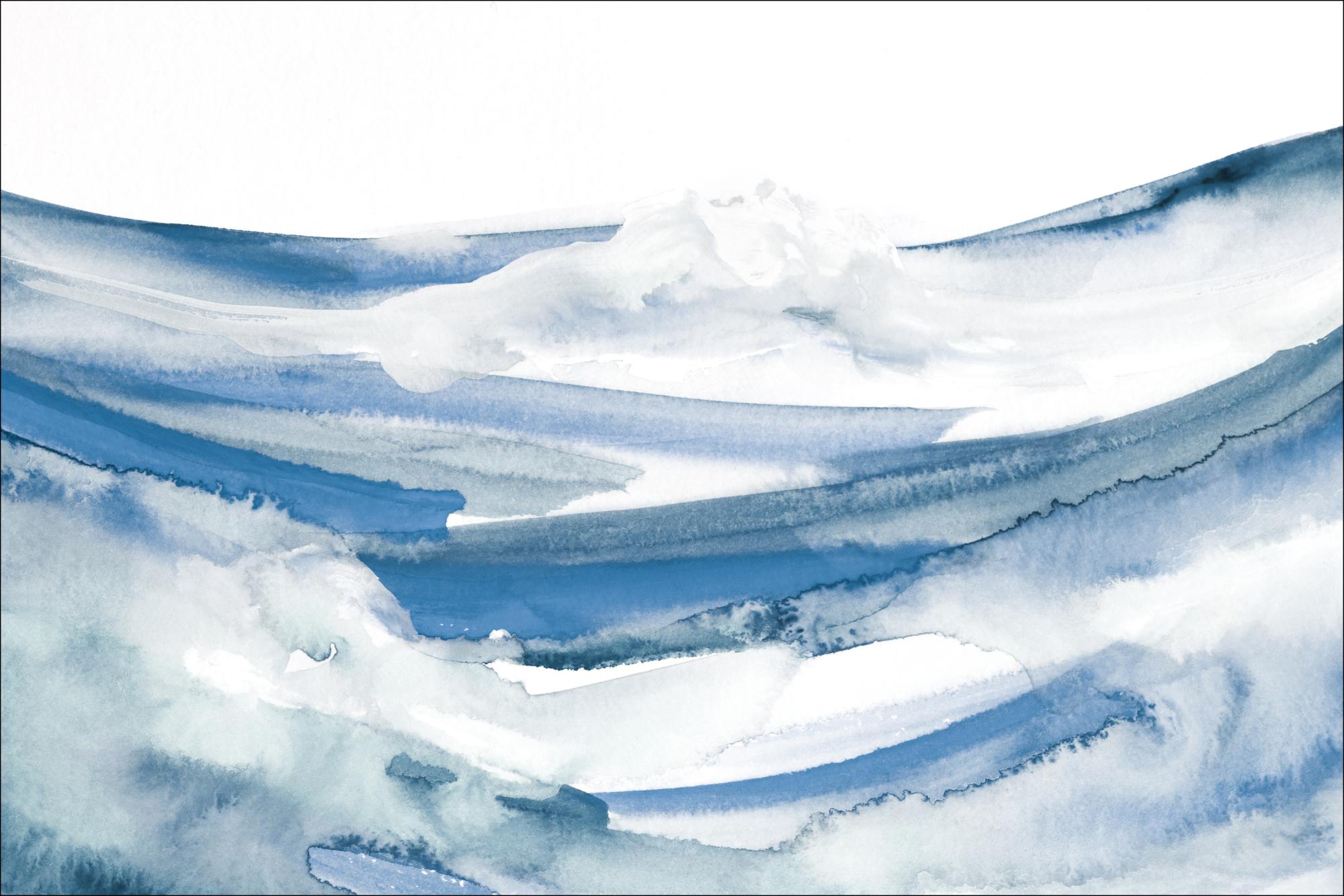 Fantastiline hele plakat suurte pintslitõmmetega sinises ja valges. Need dramaatilised värvivanikud loovad illusiooni lainetest merel. Pehmed akvarelliäärised loovad vahtu ja annavad teosele tugeva kiirustunde, kui värv keerleb ringi. Anna oma seintele liikumise tunne selle voolava teosega.