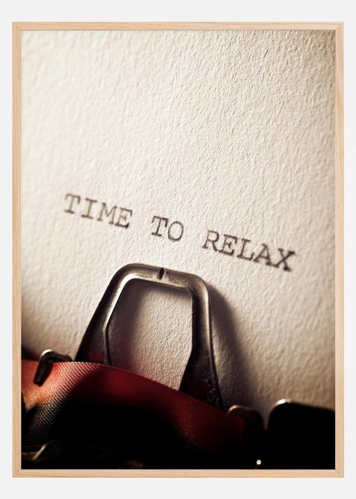 Tekstiplakat sõnumiga "Time to relax", mis on kirjutatud vanal kirjutusmasinal selle klassikalise vana kirjastiiliga. Stiilne ja elegantne plakat mõnusa retrohõnguga. Sobib enamikele kodudele ja sisustusstiilidele.