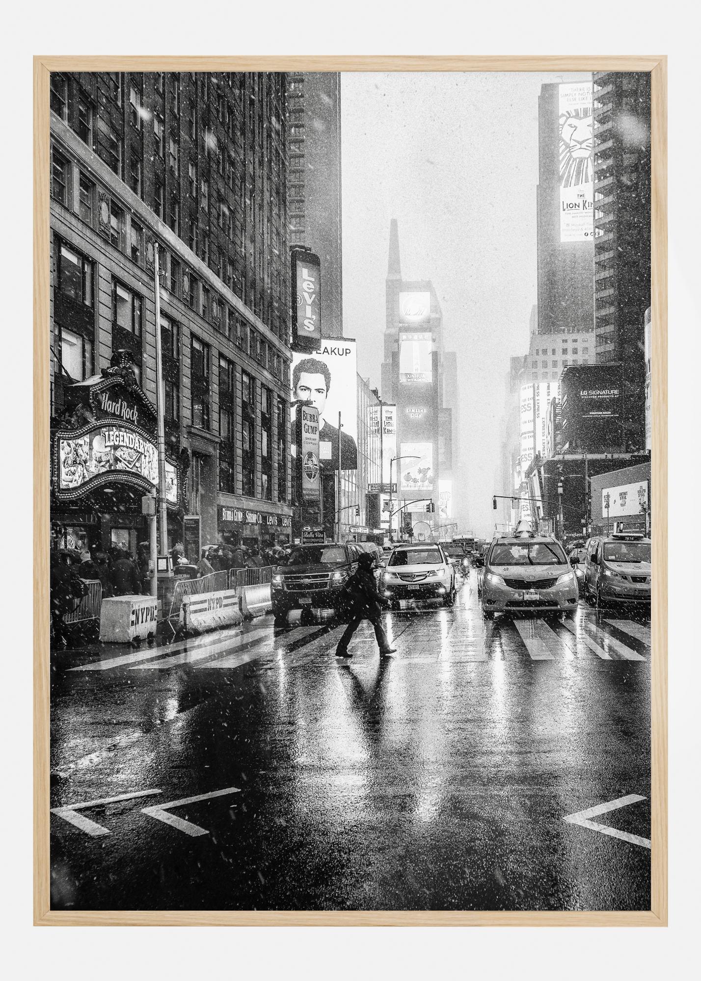 Urbanistlik plakat New Yorgi Times Square'ist. Sellel must-valgel pildil ületab üks inimene öösel vihmas tänavat. Autod ootavad, et saaksid edasi sõita. Helged reklaamtahvlid ja pilvelõhkujad on näha kauguses, kui vaatad tänavat alla. Atmosfäär on tuntav, peaaegu võiks ise seal olla.