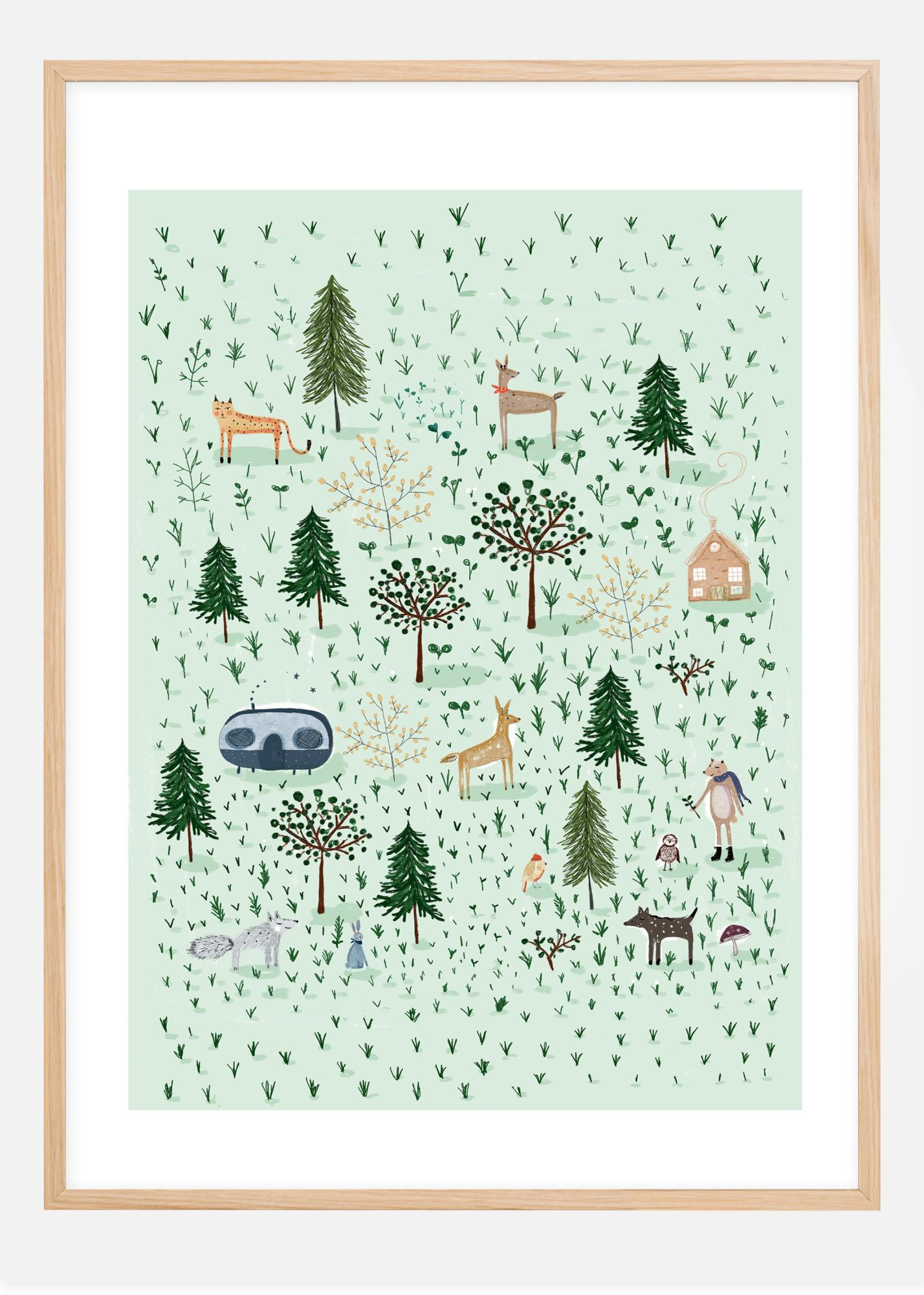 Lõbus plakat väikese metsaga, peamiselt täidetud erinevate loomadega. See on graafiline joonistus lihtsustatud puude, loomade ja majadega, mis on laiali jaotatud. Miski pole mõõtkavas. Seal on suur püstine rebane salliga ja saabastega, väike maja ja massiivne haagissuvila. See on kirev, armas ja meenutab jõulukaarti. Suurepärane plakat igasse kodu tuppa.