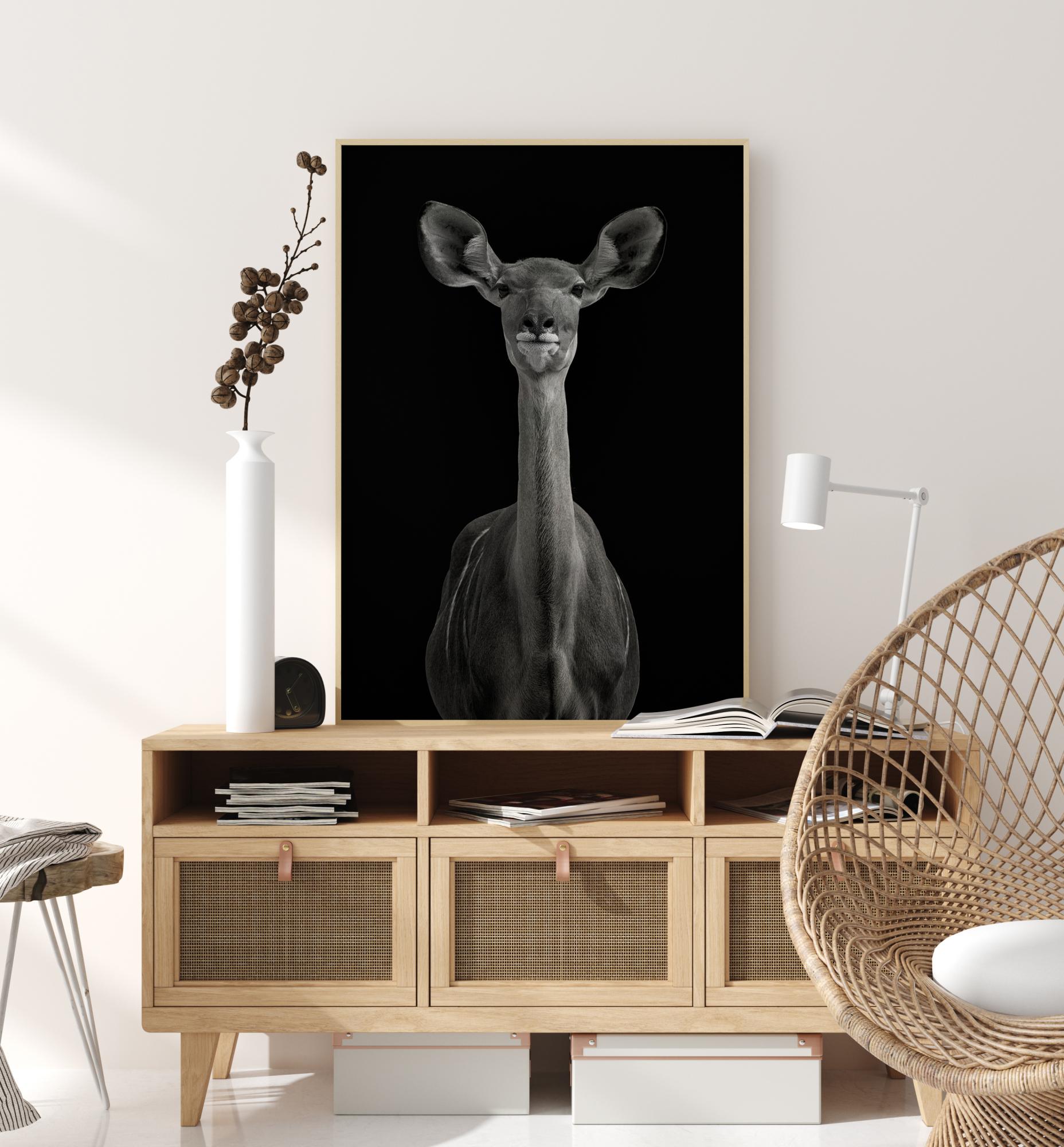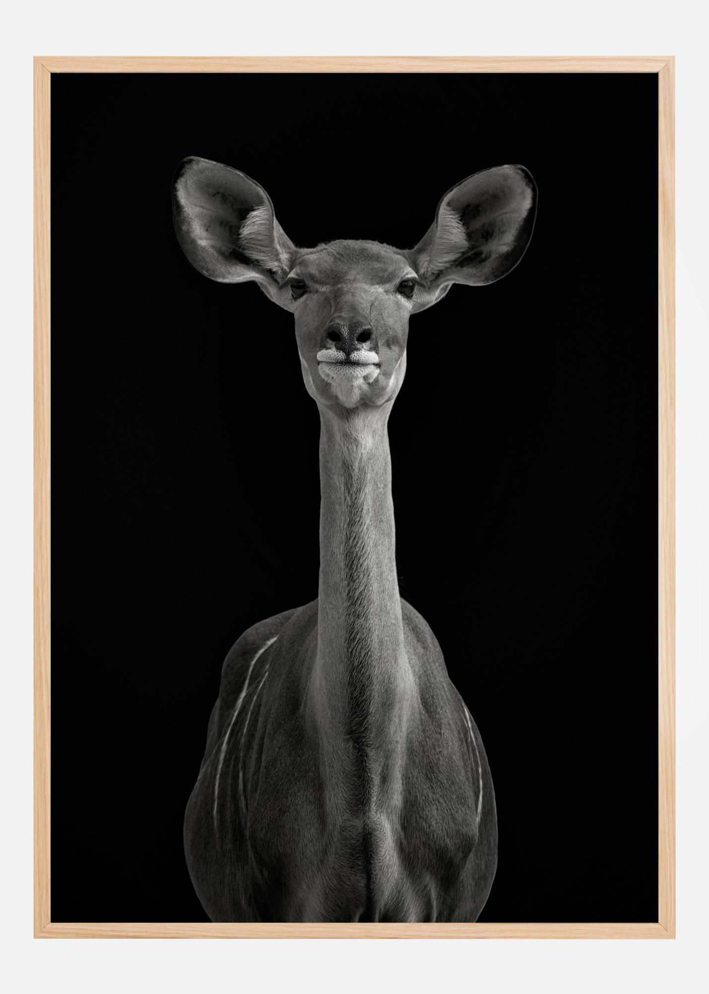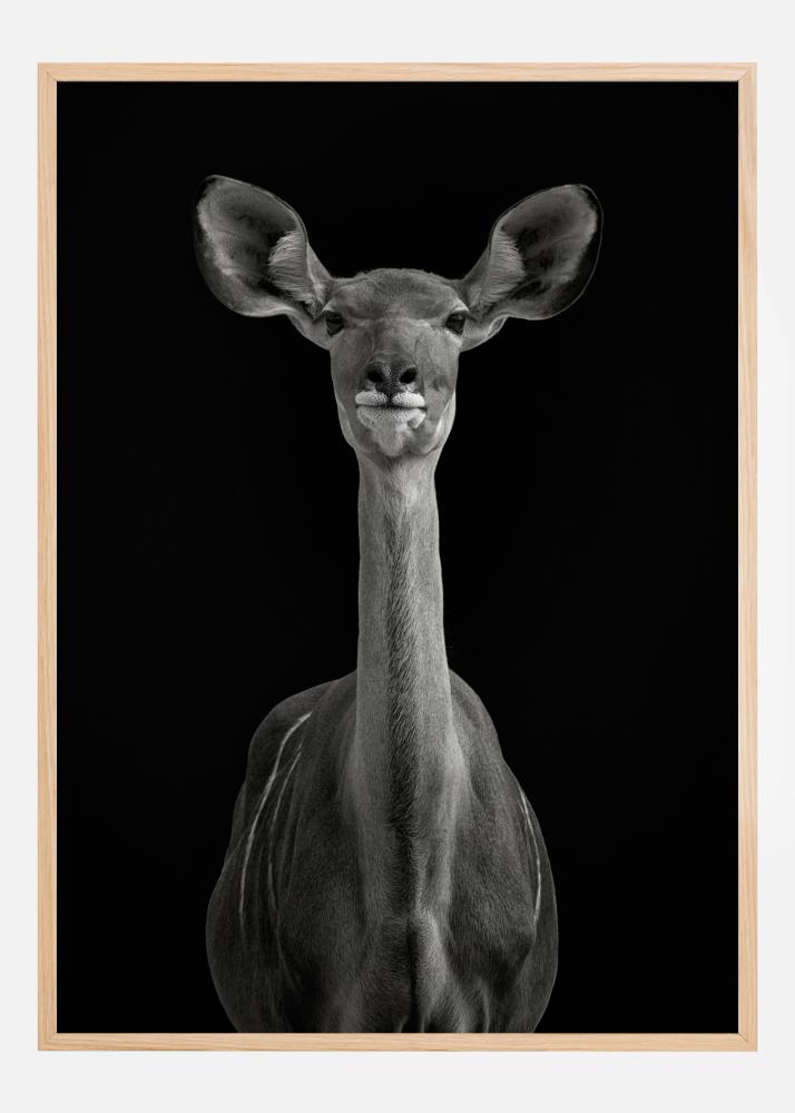 Imeline portree antiloopist sügavalt musta tausta vastu. Antiloop pöördub kaamera poole, kõrvad ettepoole suunatud, kui ta vaatab ja kuulab. Tema kael on pikk ja peenike ning silmad pehmed. Kombineeri teise loomalise trükisega, et luua suurepärane zooloogiline tunne.