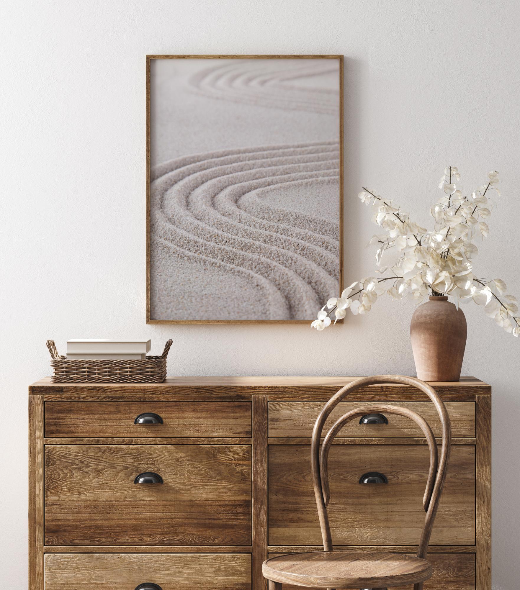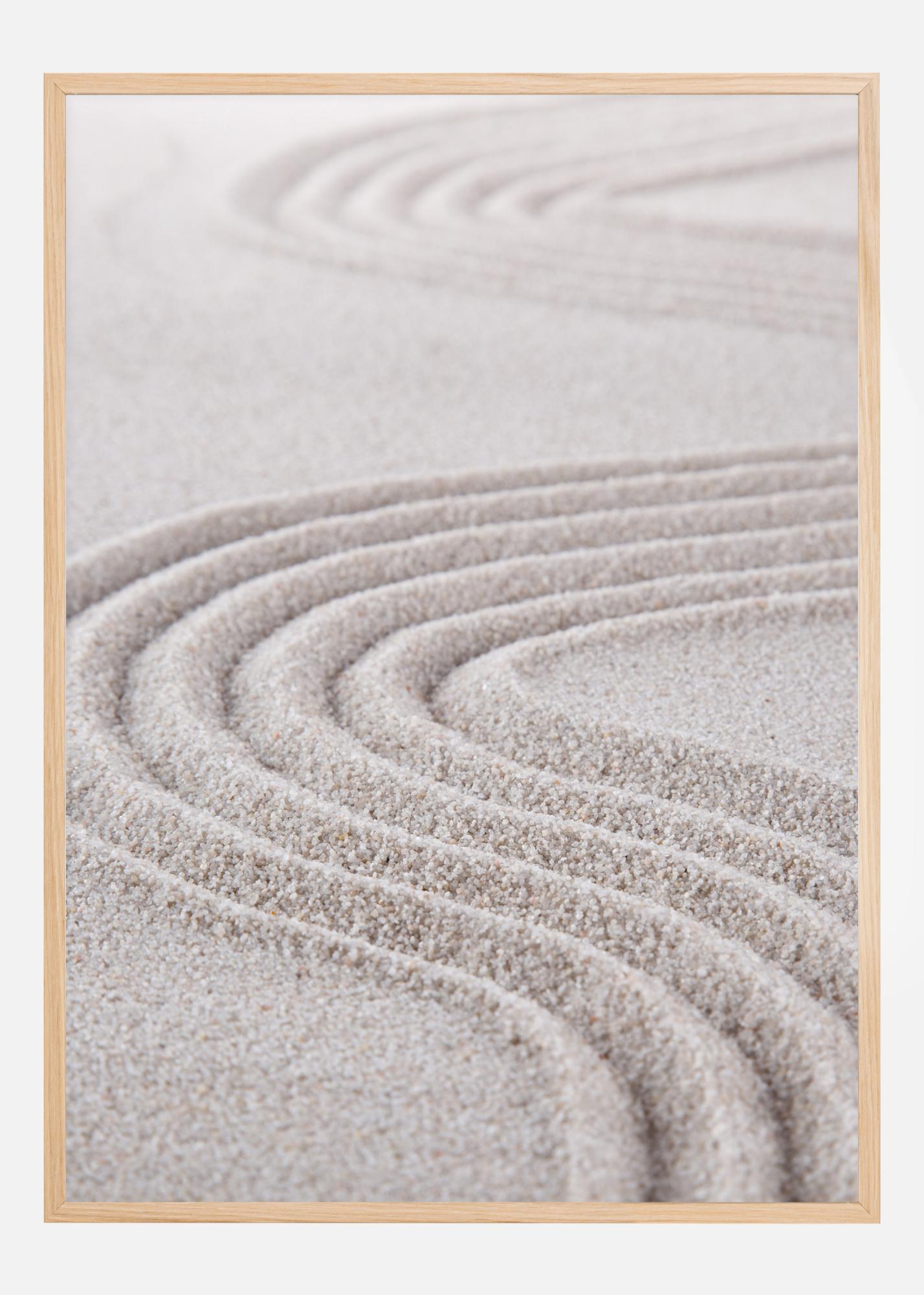 Lähivõte plakat liivale joonistatud joontega. Reha abil on loodud liivas keerised, jooned on ühtlase vahega, et tekitada sügavamaid vaod. Tänu lähivõttele on näha mustris peituvaid teri keeristena. Kombineeri beeži seinaga, et tuua pildile liivane värv.