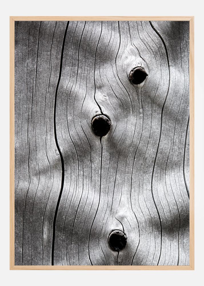 Makroplakat puutüvega, millel on kolm auku. Puidu tera on selgelt näha, kui tüve jooned põimuvad ülespoole. Kolm tumedat auku avanevad erinevates kohtades nende joonte vahel, andes tüvele tekstuuri tunde. Riputage see pilt rohelisele seinale, et saada loomulikum tunne.