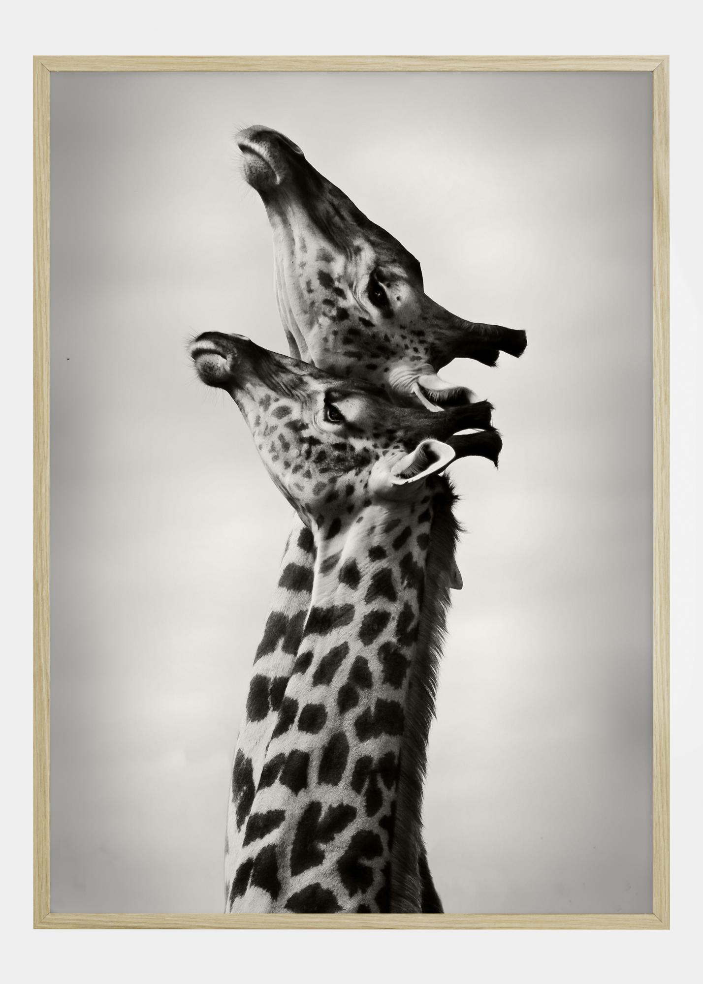 Plakatil on kujutatud lummavat hetke kahe kaelkirjaku vahel, kes tunduvad jagavat õrna suhtlust, nende kaelad elegantselt teineteise poole kummardunud. Pilt on jäädvustatud mustvalgena, mis rõhutab kaelkirjakute naha ikoonilisi mustreid ja loob tugeva visuaalse kontrasti pehme taevataustaga.