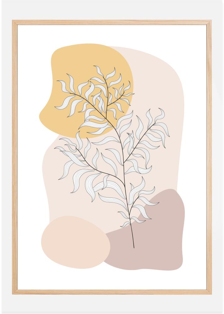 Poster trükistiilis õhukesest oksast roheliste lehtedega. Stiiliseeritud oks ja mündirohelised lehed on paigutatud ritta veidrate kujundite peale erinevates värvides. Allosas on hallid ja pruunid kivid. Ülalt on heledam oranž kuju, mis tähistab päikest, mis paistab väikesele taimele.