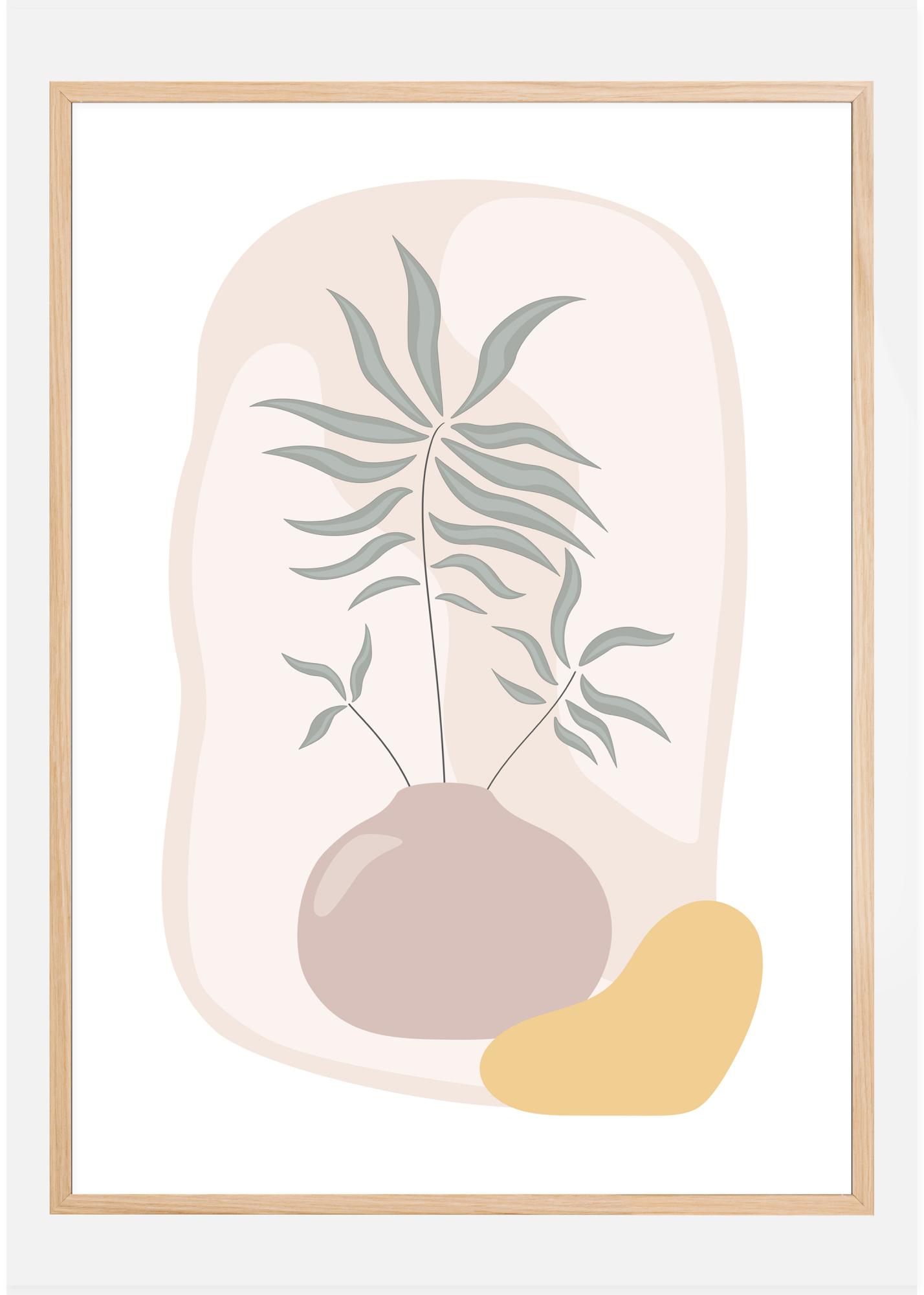 Stiliseeritud plakat vaasiga, millest torkab välja roheline taim. Taustal on teised kummalised vormid ja värvid, mis teevad sellest huvitava, kuid veidi abstraktse teose. Sobita sarnases stiilis joonistusega, et luua kodus oma mini-galerii.