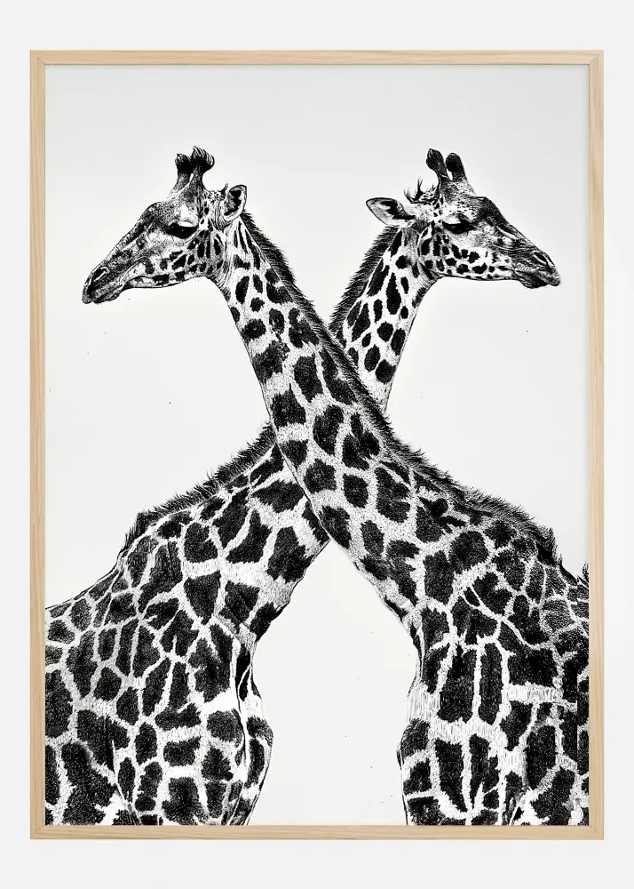 Kogege looduse pikajalgsete ikoonide majesteetlikku ilu meie mustvalge kaelkirjaku-postriga. See mõtlemapanev kompositsioon püüab kaks kaelkirjakut, kelle kaelad ristuvad graatsiliselt, luues peaaegu sümmeetrilise kuju, mis tõmbab pilgu ülespoole. Joonistuse detailirohkus toob esile kaelkirjakute ainulaadsed mustrid, muutes selle elegantseks ja kaasaegseks kunstiteoseks, mis sobib ideaalselt minimalistlikusse koju või kontorisse. Kontrastsus julgete mustade täppide ja puhta valge tausta vahel teeb sellest prindist tõelise visuaalse naudingu ja lisab teie ruumi looduse imede tunnet.