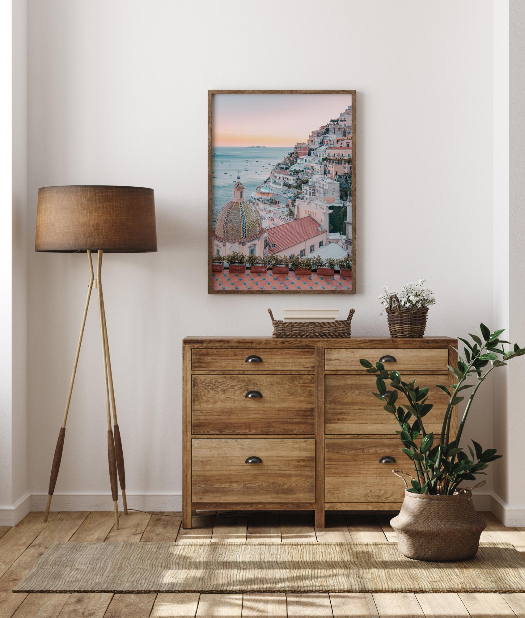 Reisiposter linnaga mere ääres. Pehmed valged ja pastellvärvi majad loovad puhkusemeeleolu selles Vahemere keskkonnas. Helesinine meri ulatub kaugele ja on täis väikesi kalapaate. Päikesetõus on nähtav otse horisondi kohal ja heidab sooja valguse üle pildi.