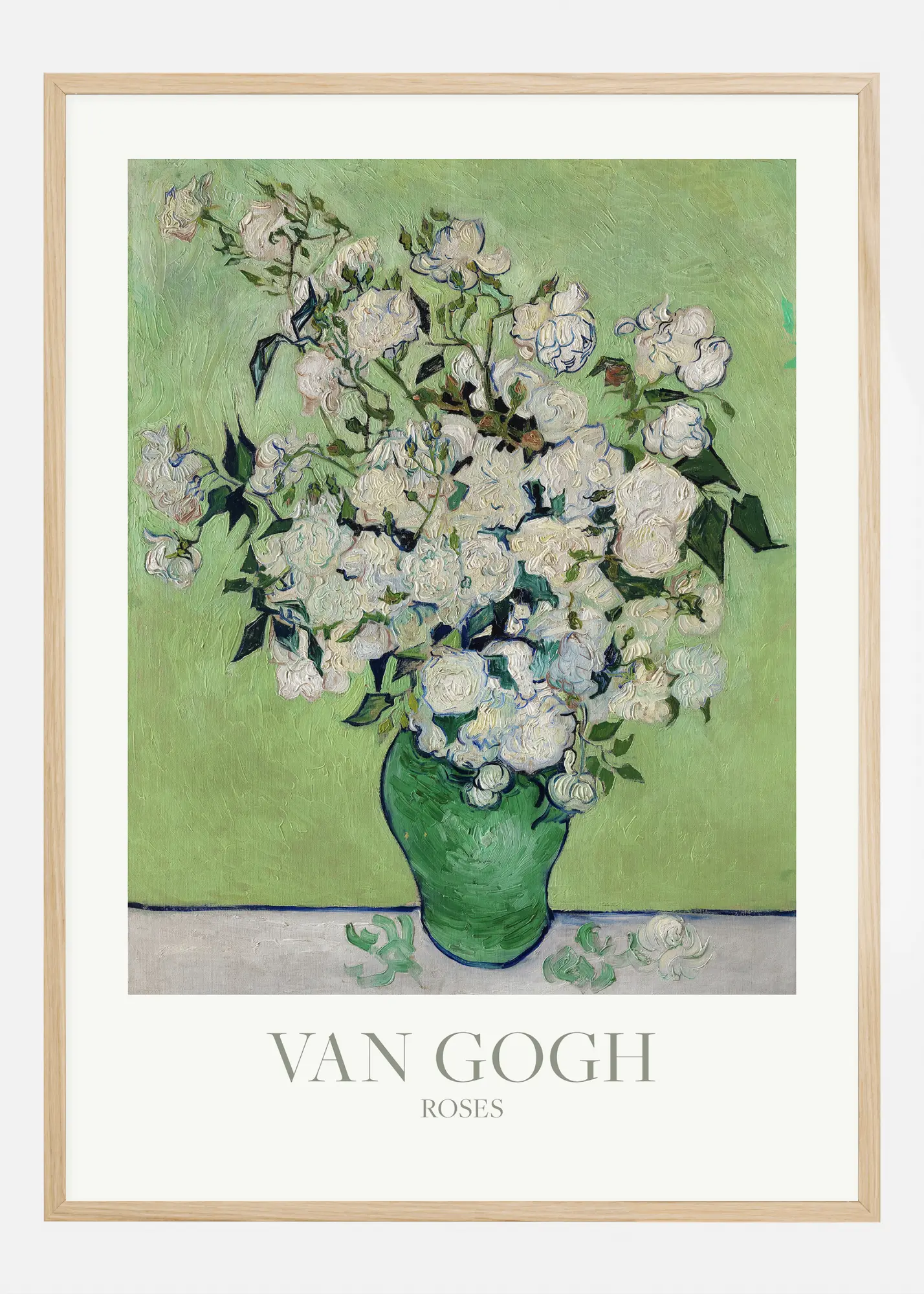 Sellel valgusküllasel ja elaval postril on kujutatud Vincent van Goghi "Roosid", maal, mis illustreerib imelist roosikimpu tugevalt rohelises vaasis. Van Goghi signatuurstiil, paksude, ekspressiivsete pintslitõmmetega ja elavate värvidega, toob esile lillede õrna ilu kontrastses taustal. See on teos, mis kiirgab nii kirge kui ka sügavat looduse ilu hindamist.