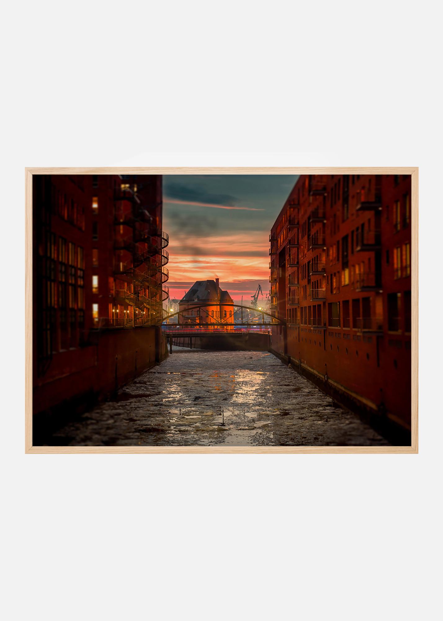 Päikeseloojang vana laohoonepiirkonna Speicherstadt kanalite ja uusgooti tellishoonega Hamburgis. Muinsuskaitse all olevas piirkonnas tehtud foto sobib hästi arhitektuuri- või ajaloohuvilise koju. Plakat näeb kõige parem välja õhukeses metallraamis, mis sobitub rangete arhitektuurivormidega ja kaunistab seina koos teiste linnavaadetega.