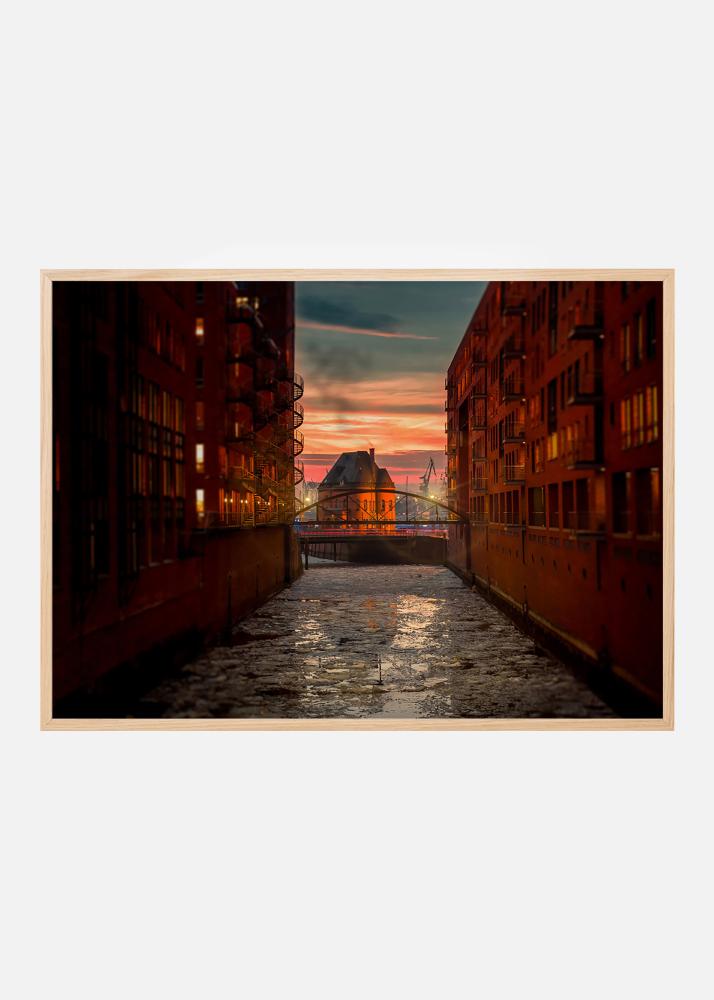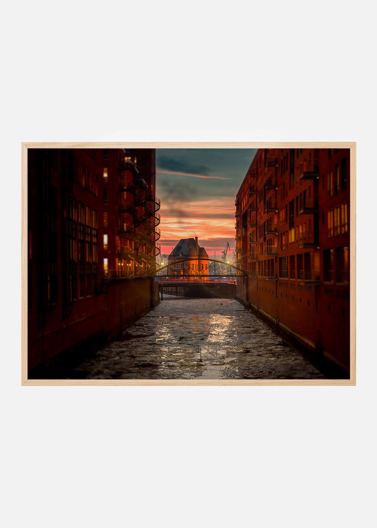 Päikeseloojang üle vanade laohoonete piirkonna Speicherstadt Hamburgis oma kanalite ja neogooti tellishoonega. Ehitusmälestisega kaitstud alast tehtud foto sobib suurepäraselt arhitektuuri- või ajaloohuvilise koju. Poster näeb parim välja õhukeses metallraamis, mis sobib kokku range arhitektuuriga ja näeb seintel kena välja koos teiste linnafotodega.