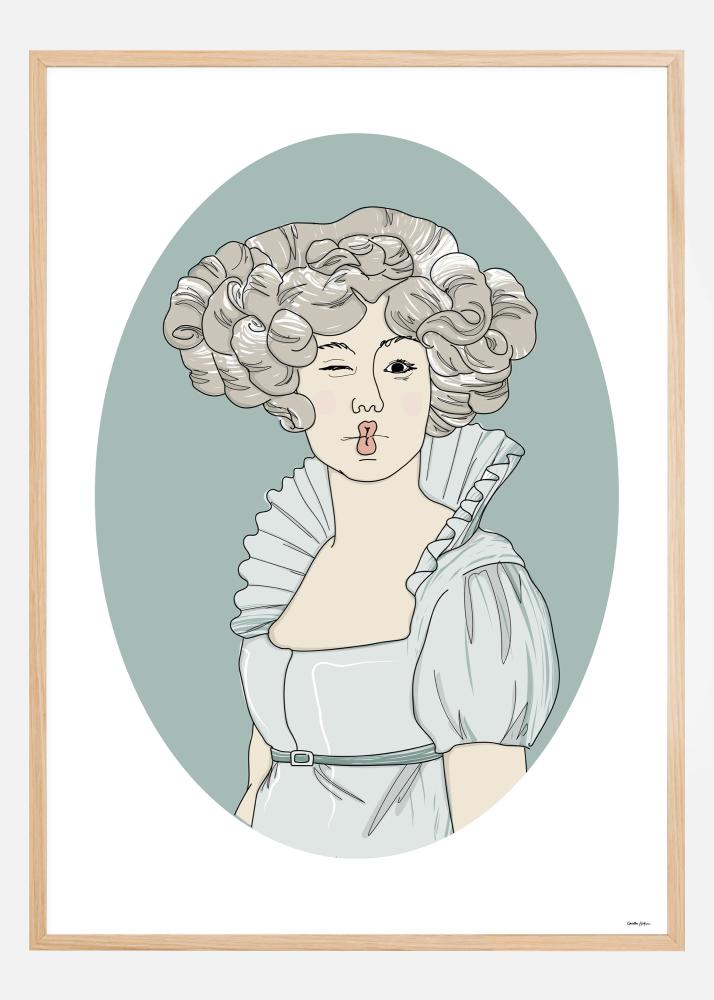 Näpukas plakat, millel viktoriaanlik Violetta silmapilgutusega kergelt alalhoidlikult pildilt välja vaatab, huuled suudlusse pruntis. Tema hallid lokid sobituvad pehme sinakashalli kõrge kaelusega kleidiga. Pilt asub ka sinises ovaalis, et meenutada vanu väikseid medaljonipilte ja luua unikaalne, omanäoline kunstiteos.