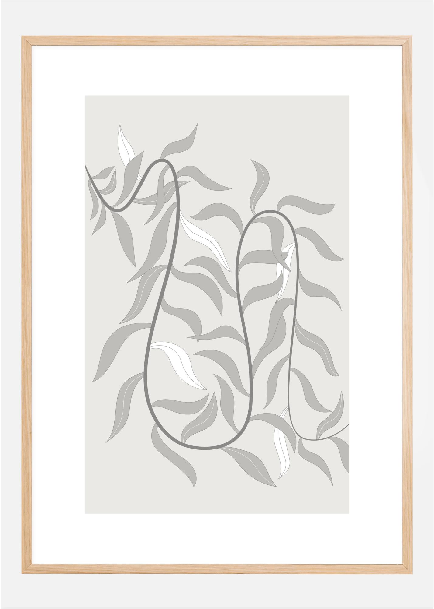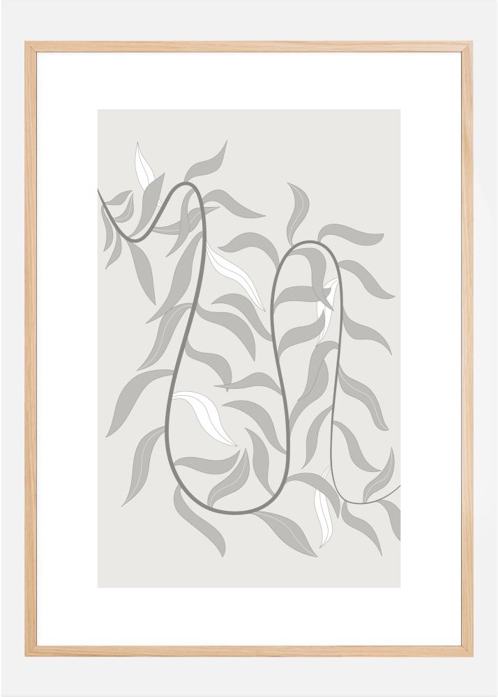 Abstraktne botaaniline plakat, millel on mööda plakatit looklev roomav viinapuu. Kujundus on lihtne trükistiil, mille lehed on helehallid ja valged. Tumehall viinapuu lookleb lehtede vahel ja ühendab kõik keerleva kujundiga. Kombineerige pehme rohelise seinaga, et luua lehestiku efekt.