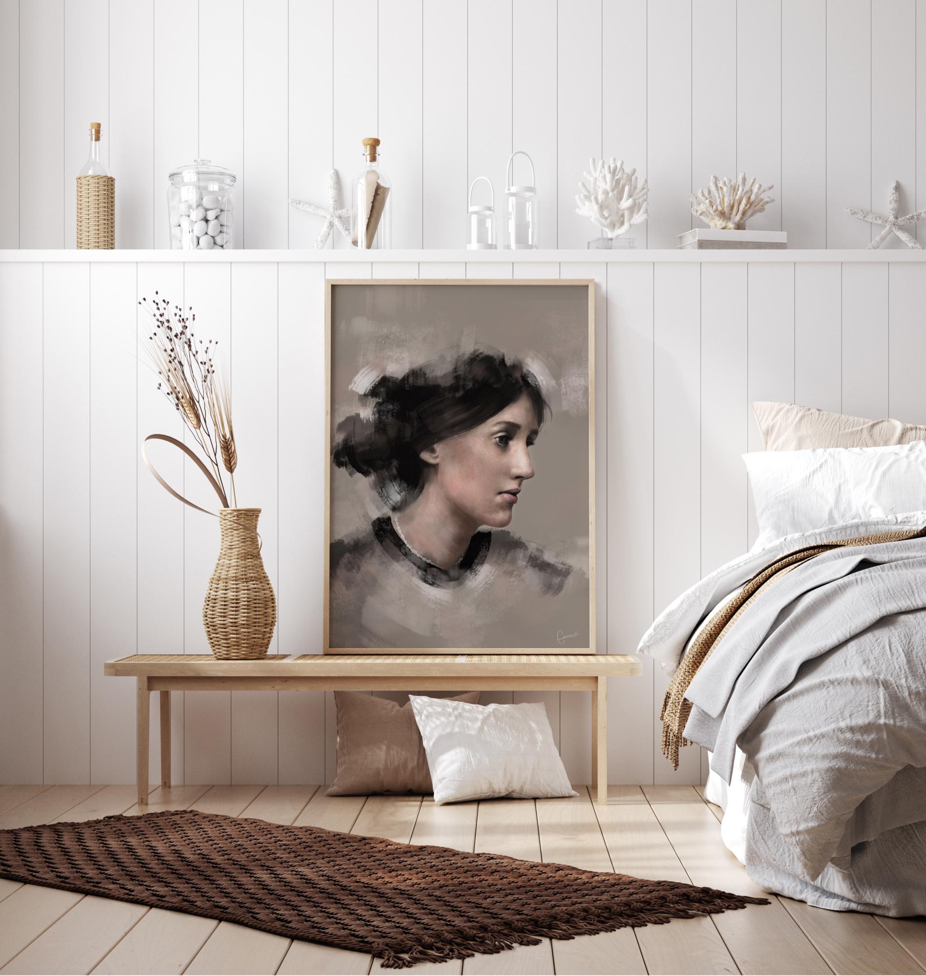 Portreepilt Virginia Woolfist profiilis. Tema juuksed on pehmed lihtsad värvilaigud, kuid tema nägu on esitatud hoolikate detailidega. Portree on pehme ja naiselik ning annab tema näole peaaegu melanhoolse tooni, kui ta vaatab kaugusesse.