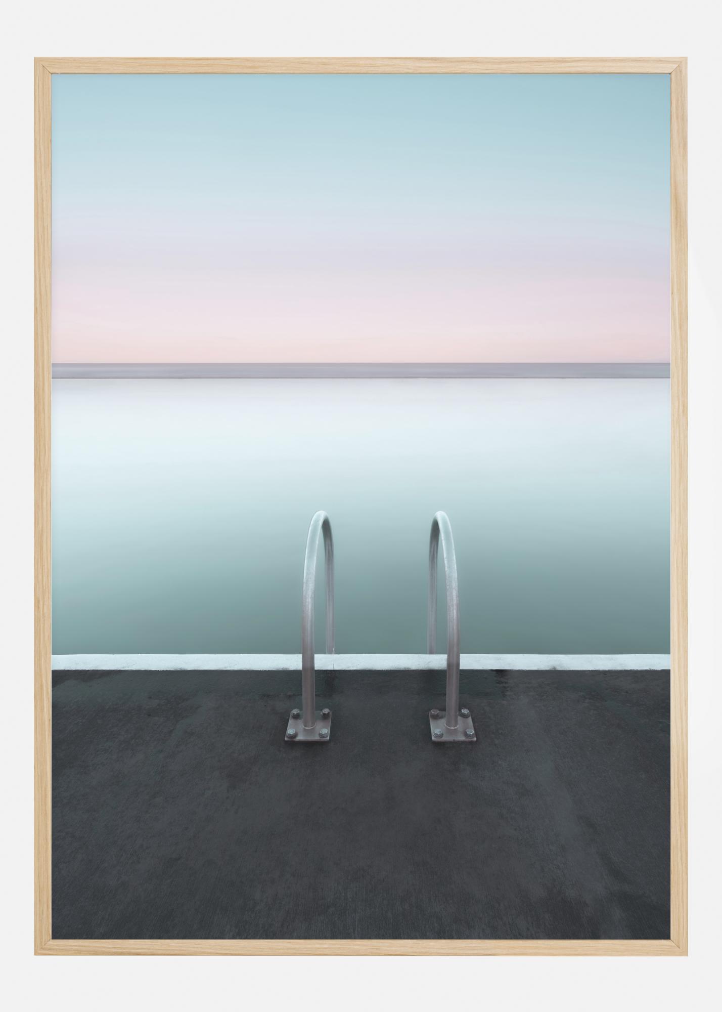 Pastellvärviline plakat basseiniredeli käepidemetega, mis viivad üle platvormi ääre avarasse sinisesse merre. Käepidemed on kutsuvad ja julgustavad sind järgima neid üle ääre avarasse sinisesse vette. Taustal on näha pehmet kahvaturoosat taevast, kui varase hommiku valgus saabub.