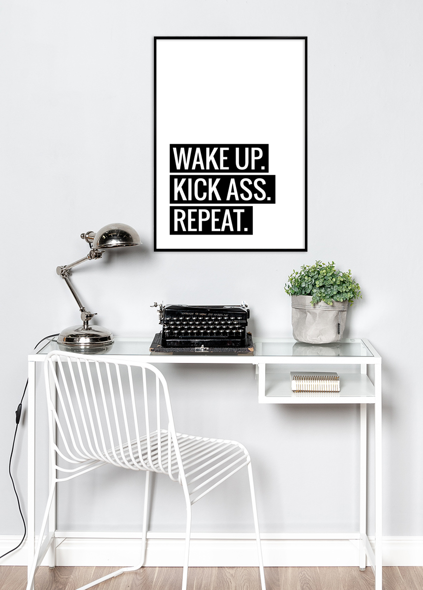 Iga päev täiesti vinge olemine ei tule alati loomulikult. Selle pärast ei ole vaja häbeneda! Julgusta end selleks, paigaldades seinale selle uhke postri. Plakat on stiilse ja lihtsa disainiga, valgel taustal ning must-valge trükiga tekstiga ”Wake up. Kick ass. Repeat.” Saadaval 6 erinevas formaadis ja hinnaklassis. Täienda kindlasti meie suurest valikust pärit musta või värvilise raami abil.