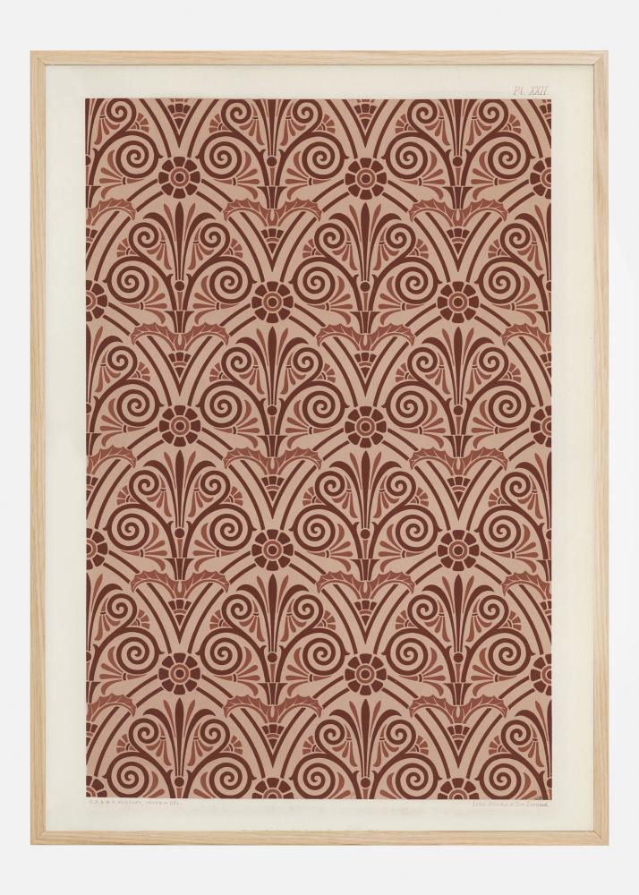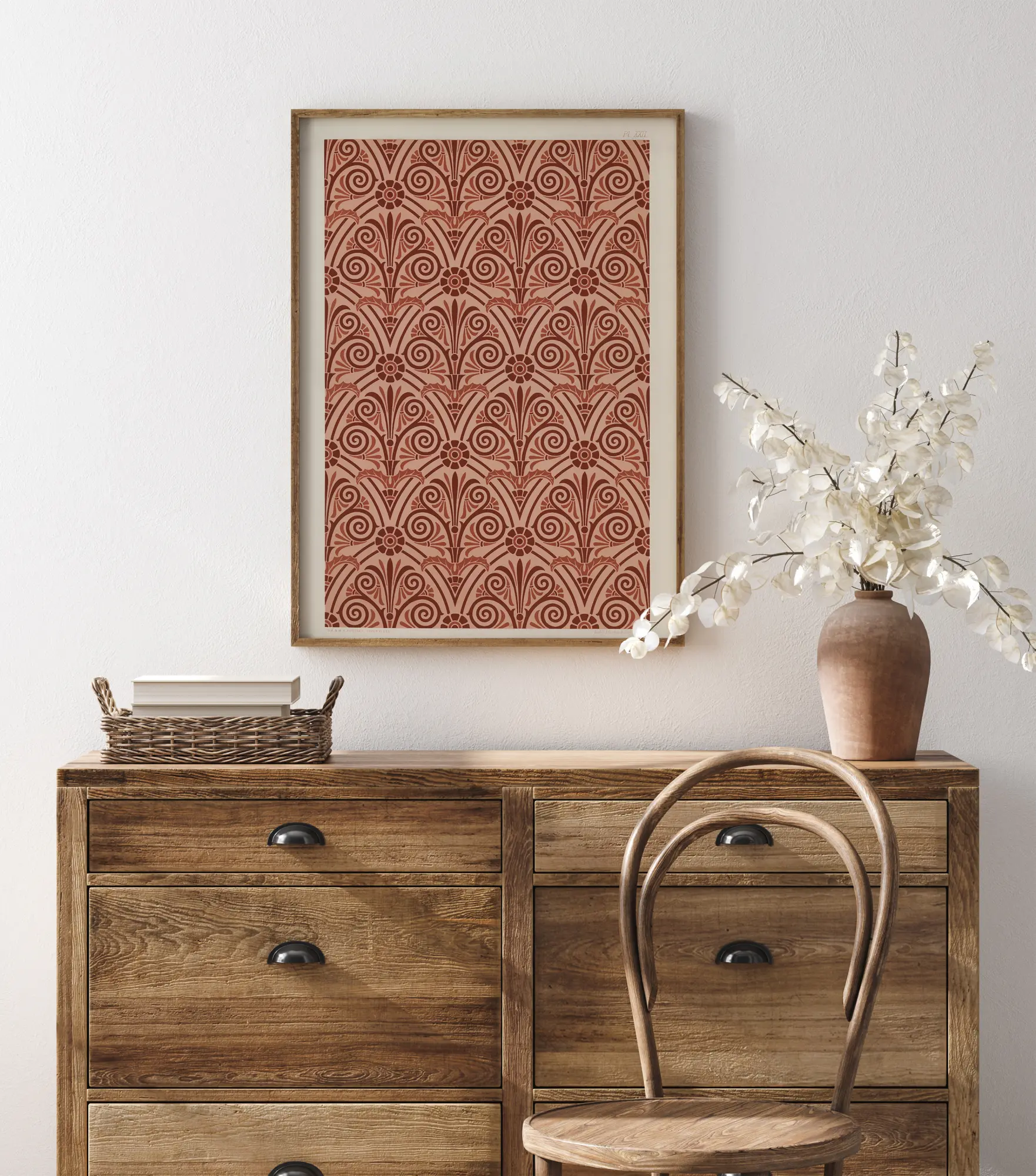 Heledate mustritega plakat punaste korduvate mustritega. Mustrite sees on lokkis ringid, mis näevad välja nagu lehed või narmad. Samuti on regulaarselt paiknevad lillekujud, mis muudavad selle botaaniliseks trükimustriks. Ideaalne tapeetimiseks, vaata, milliseid pilte sa neis keerukates mustrites näed.