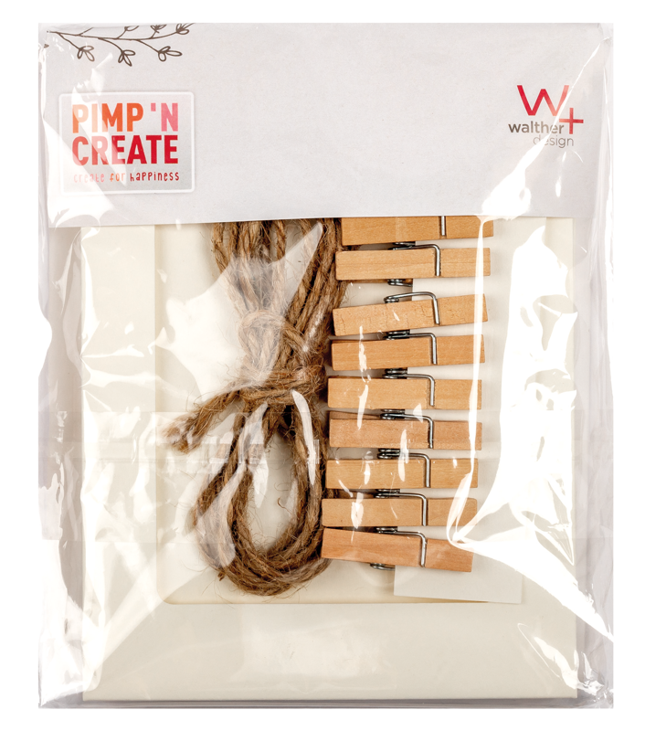 Fotokett 10 paberraamiga beežis toonis, fotodele suuruses 10x15 cm. Keti pikkus on 180 cm ja sisaldab 10 puidust klambrit, mida saab kinnitada džuutpaelale. Paberist pildiraamid on katmata, mis võimaldab neid ümber värvida või kaunistada vastavalt soovile.