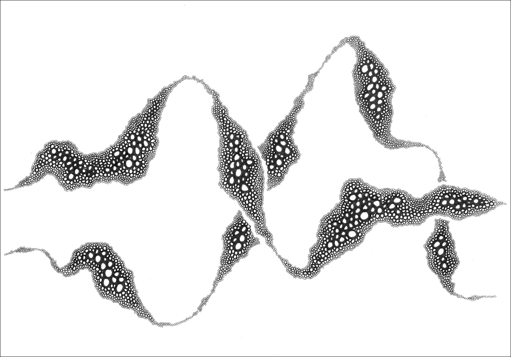 Dramaatiline abstraktne plakat erinevate mustade ja valgete ringidega, mis loovad kummalisi voogavaid laineid valgel taustal. Seal on suuri ja väikeseid ringe nagu mullid, mis on kinnitatud pikkadesse voogavatesse nööridesse, keerates ja kõverdudes üle pildi ning lõikuvad teineteisega selles kummaliselt paeluvaks teoses.