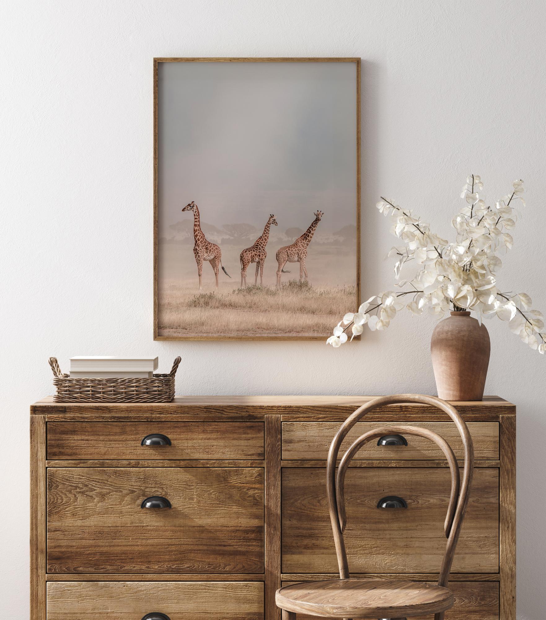 Kaunis ürglooduse väljendus kolme kaelkirjakuga Aafrika savannis. Kaelkirjakud vaatavad eri suundadesse, samal ajal kui nad võitlevad Amboseli tolmutuultega, mis keerlevad spiraalidena ja tekitavad uduse efekti. Külasta Aafrikat kodust lahkumata selle emotsionaalse plakatiga.