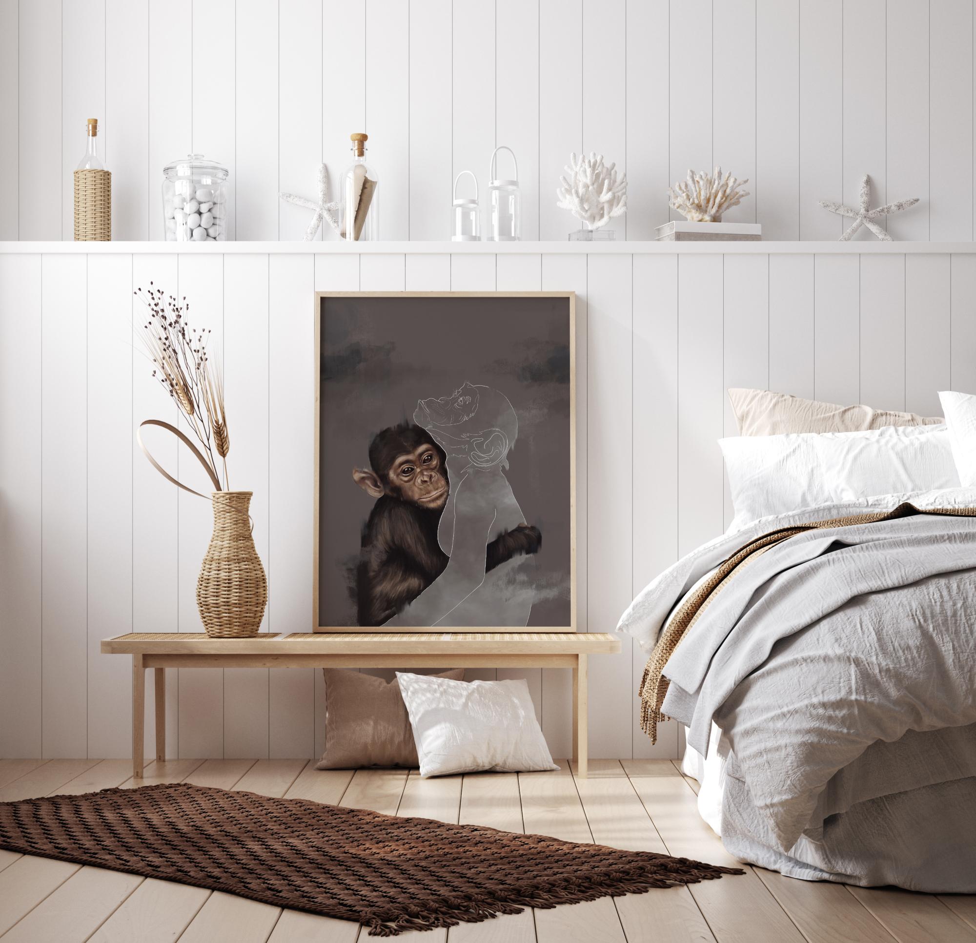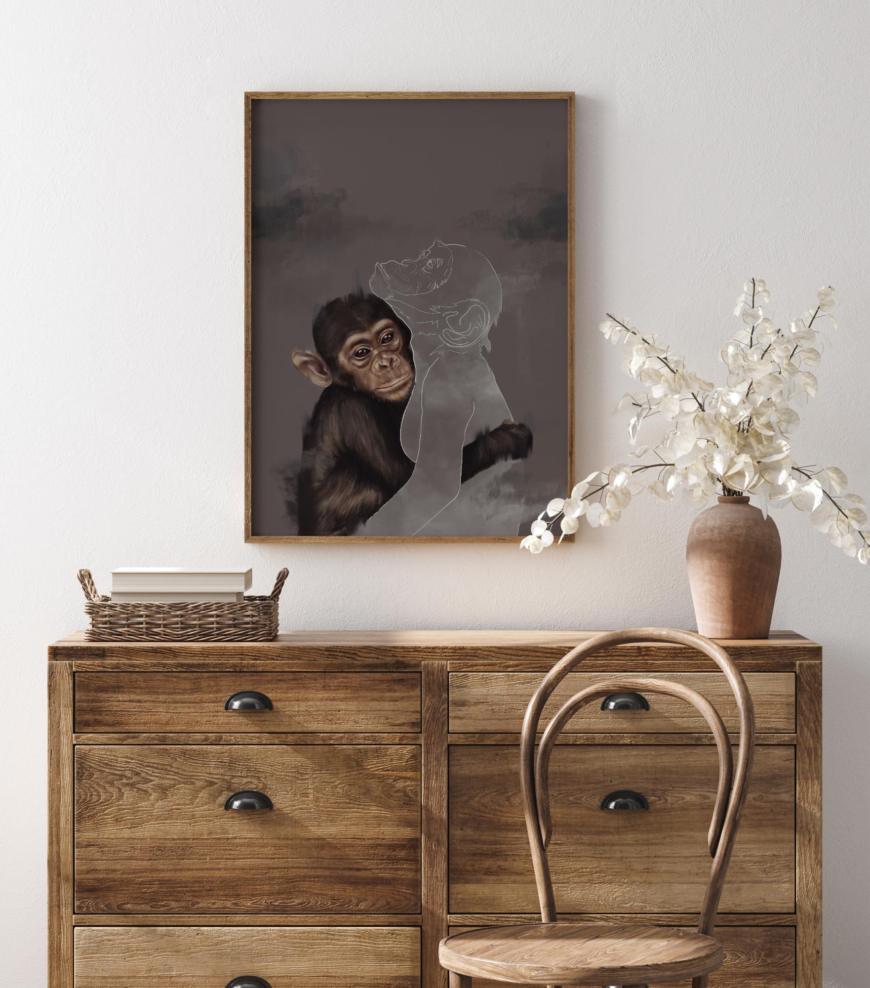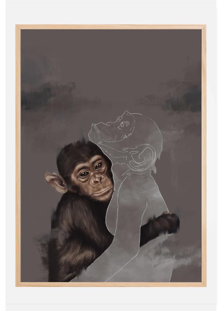 Fantastiline plakat segatehnikas, millel on noor šimpans, kes kallistab teise šimpansi kontuuri. See emotsionaalne pilt kujutab üksikasjalikku maali šimpansist, kes mähib oma käe teise šimpansi valge kontuuri ümber. Teine on puudu, nii et kus on teine ahv ja miks see enam seal ei ole?