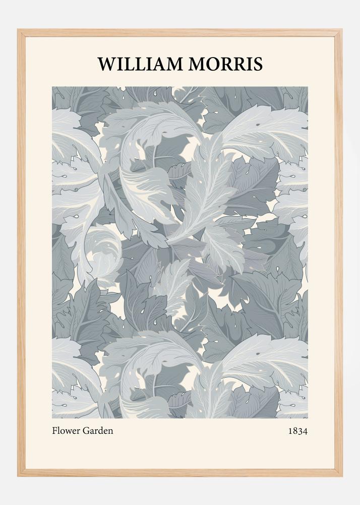 See plakat oma lopsakate ja rafineeritud William Morrise motiividega pakub nii rahu kui ka klassikalise elegantsi tunnet. Disain on ode külluslikule rohelusele, mida sageli seostatakse Morrise ja tema tööga Arts and Crafts liikumises. Motiiv, nimega "Flower Garden", sisaldab tihedat lehtede ja õite kompositsiooni, mis on esitatud jahedates sinise ja halli toonides koos kreemvalgete nüanssidega. Iga selle plakati detail on hoolikalt läbimõeldud, luues voorusliku ja korraliku aia tunde.