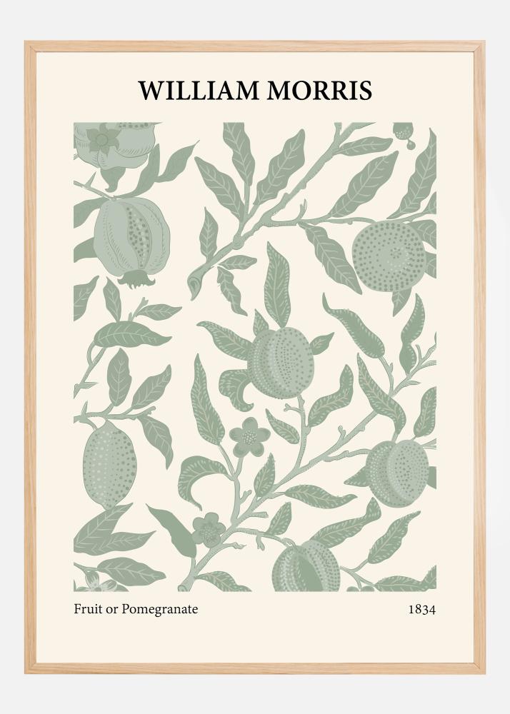 Sellel eristaval William Morrise plakatil, mille nimi on "Puuvili või granaatõun", haarab vaataja tähelepanu hoolikalt paigutatud puuviljade ja lehestiku mustriga. Kunstiteos mõjub nii värskendavalt kui ajatut, oma rahustavates rohelistes toonides lehtede ning õrnalt kreemjasil taustaga. Granaatõunte unikaalne kuju ja struktuur tõstetakse esile kontrastsete tumedamate roheliste lehtede abil, luues disainis meeldiva rütmi ja visuaalse sügavuse. See on plakat, mis kannab tugevat sidet looduse ja selle lopsaka iluga.