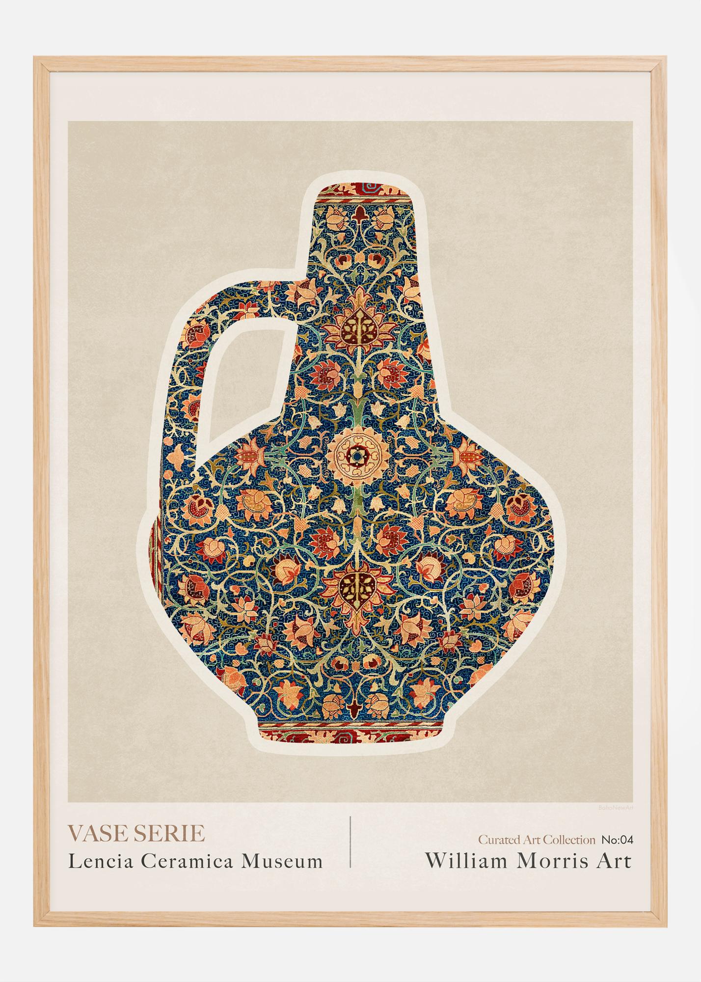 See poster, mis on number 04 "Curated Art Collection" Lencia Ceramica Muuseumist, on rikkalik ja keerukas austusavaldus William Morrisele ja tema olulisele panusele mustrikunsti. Siin on esitatud stiilne vaas, kaetud detailse ja värvika mustriga, mis kiirgab viktoriaanlikku ajastu lummust idamaise ja keskaegse kunsti vastu, stiili, mida Morris aitas populariseerida.