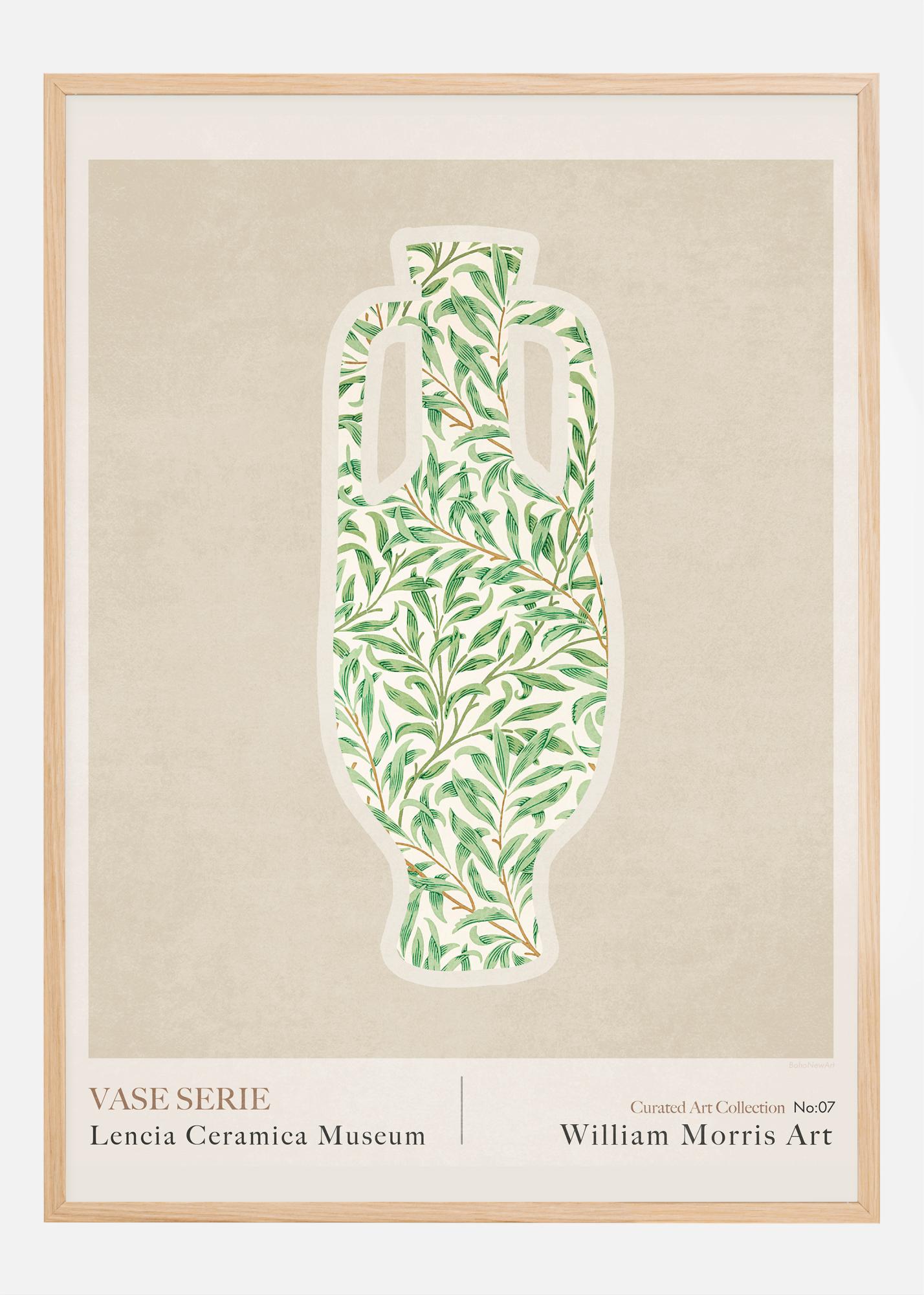 Selle peen ja loodusest inspireeritud plakati number on 07 meie "Kuraatorikunstikollektsioonist" Lencia Keraamika Muuseumist, mis tähistab William Morrise kunstipärandit. See kujutab klassikalise vaasi siluetti, mis on täidetud ühe Morrise eristuva rohelise taimemustriga, näidates tema meistrilikku viisi kombineerida kuju ja funktsiooni esteetilise iluga disainis. See on ajatu austusavaldus Morrise visioonile ja tema võimele ammutada inspiratsiooni loodusest ja muuta see kunstiks.