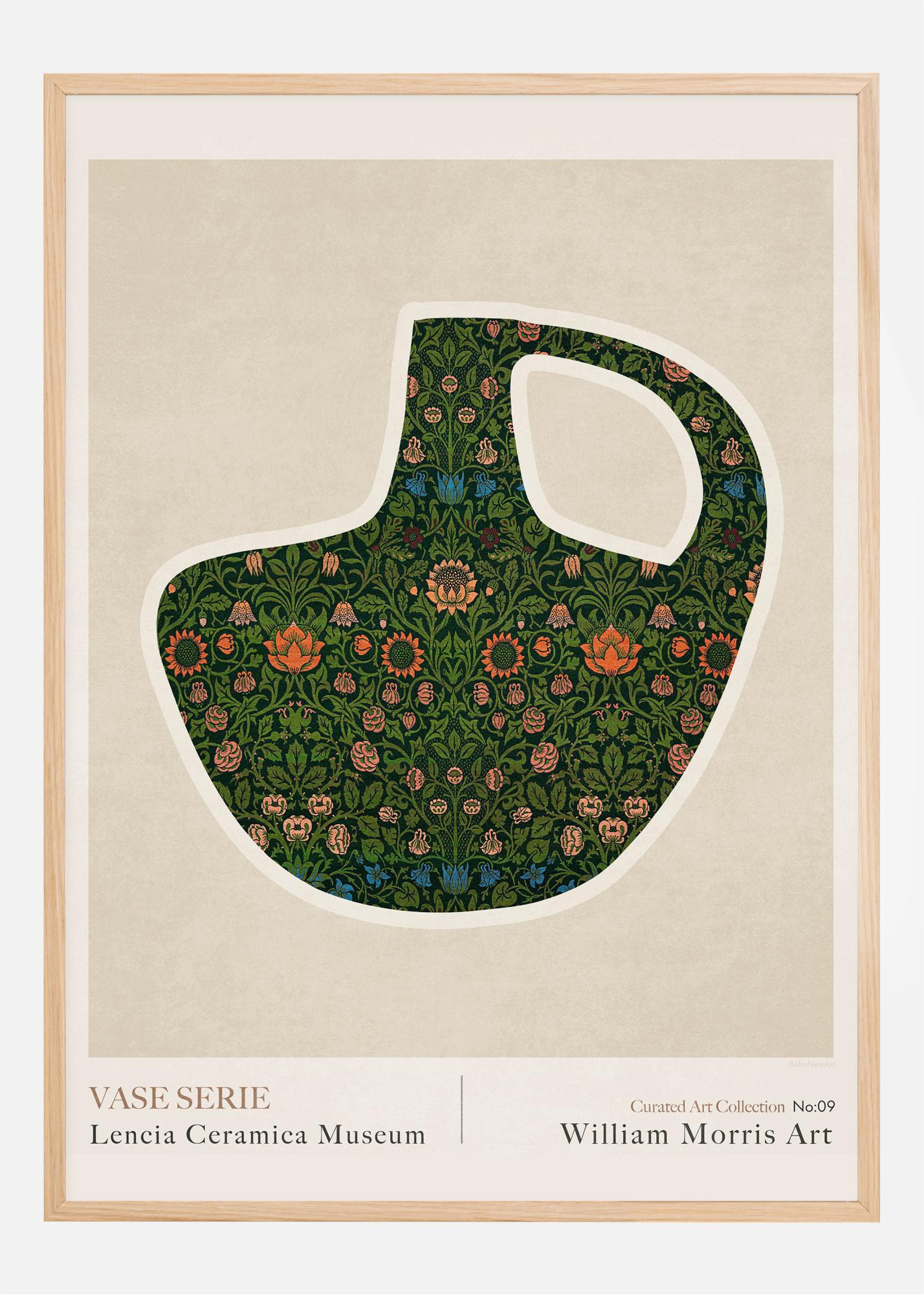 Posteri värvilahendus on sügav ja soe, toonides rohelist, oranži ja roosat, moodustades rikkaliku ja keeruka paleti. See rafineeritud värvikompositsioon paistab kaunilt vastu neutraalset tausta ja tõuseb esile lihtsas ja puhtas puitraamis (ei kuulu motiivi hulka). Lencia Ceramica Muuseumi vaasiseeria number 09, see afišš on austusavaldus William Morrise kunstnikule ja pakub elegantset ja ajalooliselt seotud kaunistust kõigile, kes hindavad disaini suurust ja loodusmotiivi ilu.