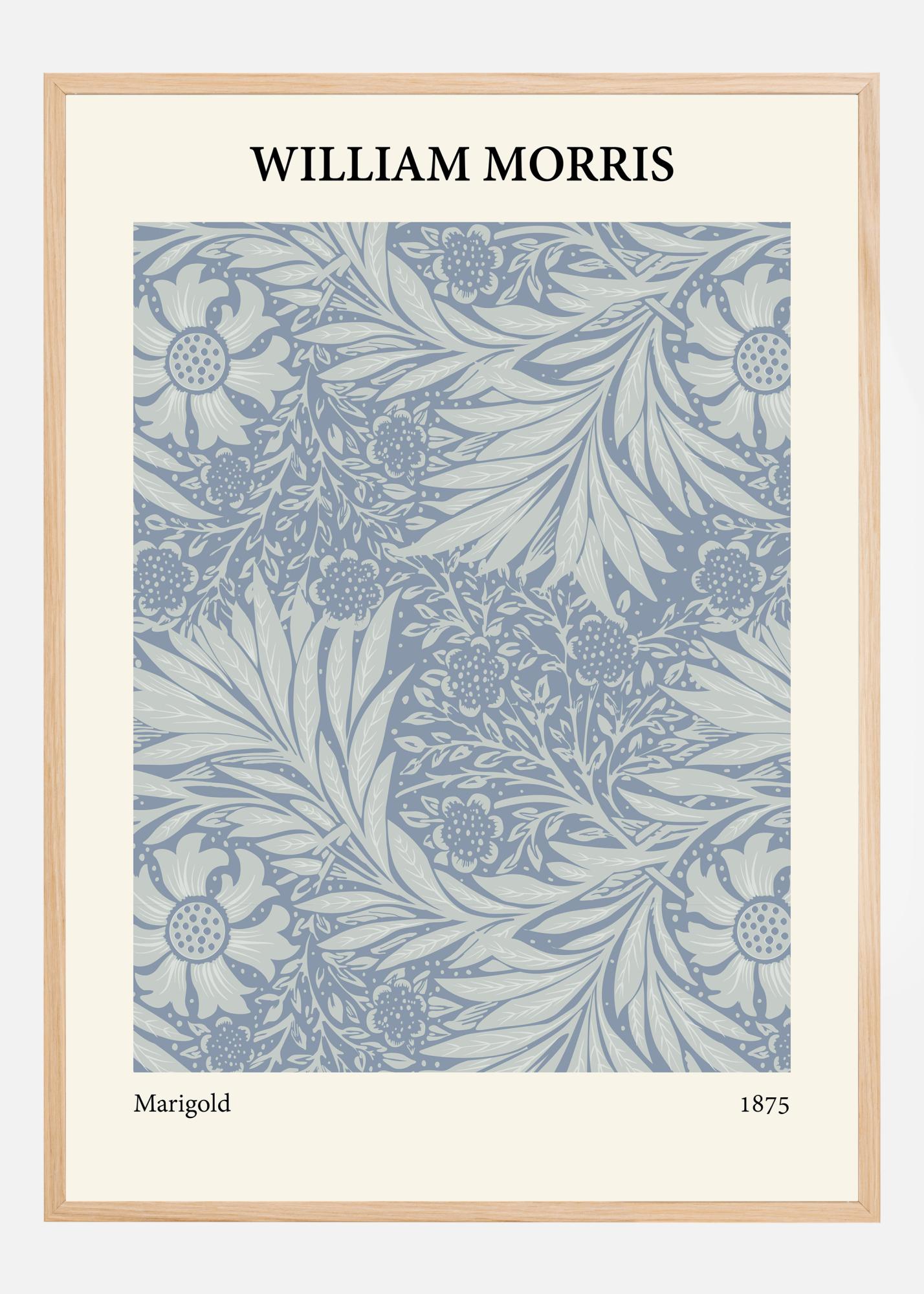 Selle kaunilt kujundatud William Morrise plakati keskmes on "Marigold" muster aastast 1875 köitvas sinises värvipaletis. Mustri detailirohkus ja loodusele lähedane stiil peegeldavad Morrise võimet luua kunstiteoseid, mis austavad ja peegeldavad looduse ilu. See disain esindab viktoriaanliku ajastu käsitööoskust ja Kunstid ja Käsitöö liikumise käsitsi valmistatud esemete väärtustamist.