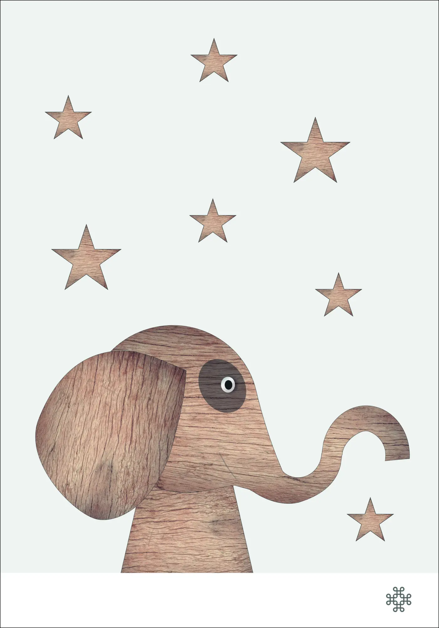 Plakat puidumustriga armsa elevandiga, mida ümbritsevad tähed. Elevand on valmistatud puidumustrite kollaažist, mis annab sellele struktuurse efekti. Tähed on paigutatud ümberringi, et luua see leidlik pilt, mis on positiivne ja rõõmus täiendus igasse lastetuppa.