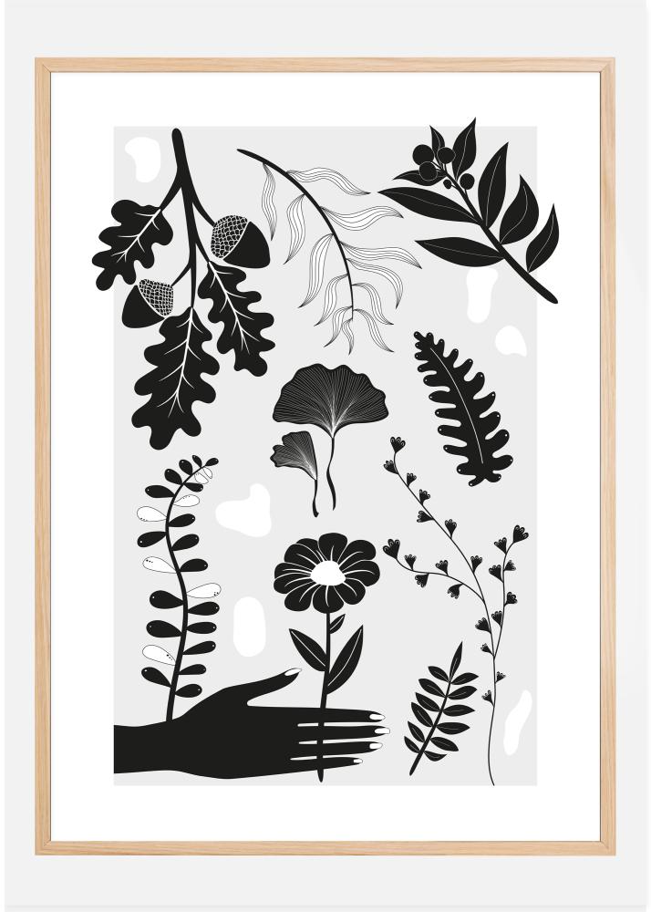 Julgene plakat mustvalgete erinevate lehtede, taimede ja lillede kujutistega. Must käsi ulatub, et haarata ühe stiliseeritud lille järele. Tammepähklid, lilled, sõnajalad ja palju muud täidavad selle lihtsa, kuid huvitava trüki. Aseta ennast botaanilisse meeleollu, kui riputad selle taimeplakati oma koju.