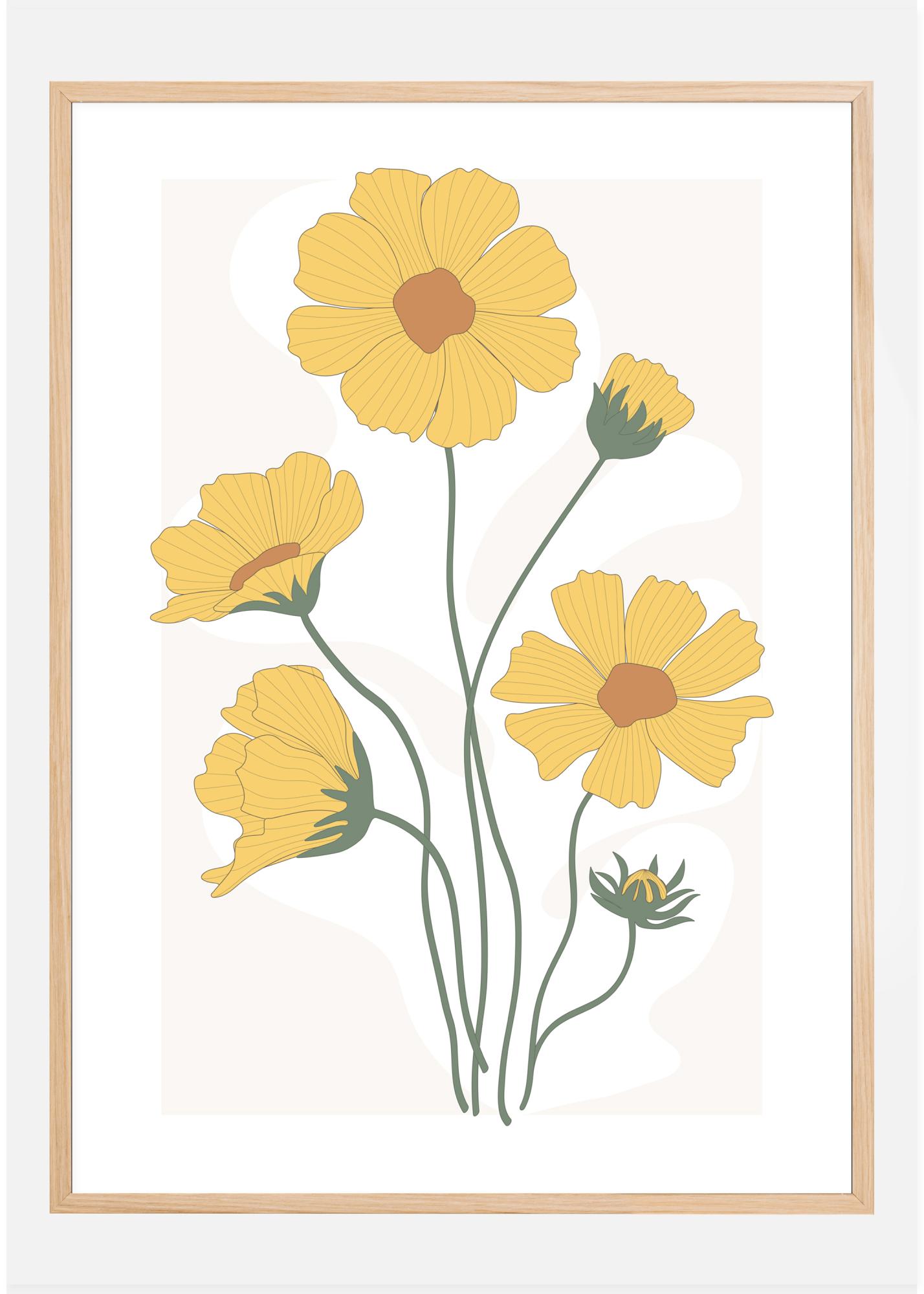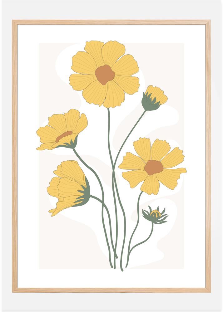 Hele poster kollaste saialilledega, mis on loodud lõbusas trükkimisstiilis. Iga lill särab valgel taustal. Kuigi see on lihtne stiliseeritud disain, on lilled rõõmsad ja ideaalne viis ärgata naeratus huulil.