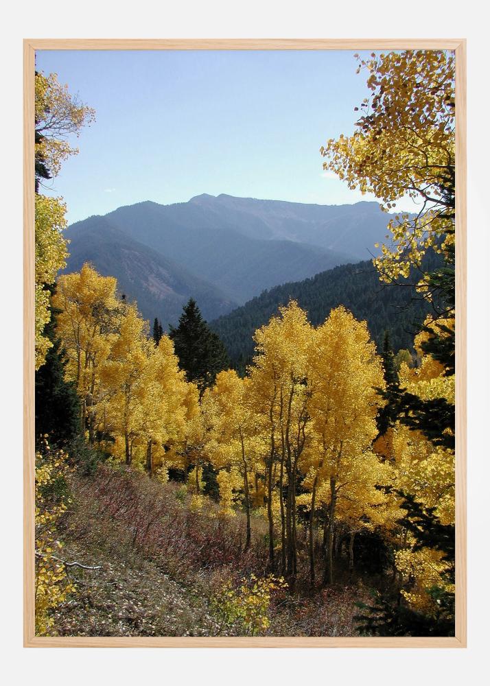Hele maastikutrükk kollaste puudega sinise mäeaheliku taga. Kollased puud loovad tõelise hilissuvisetunde, valgustades selle metsa stseeni. Tunne sooja tuuleõhku mäestikus selles varajase sügise pildis.