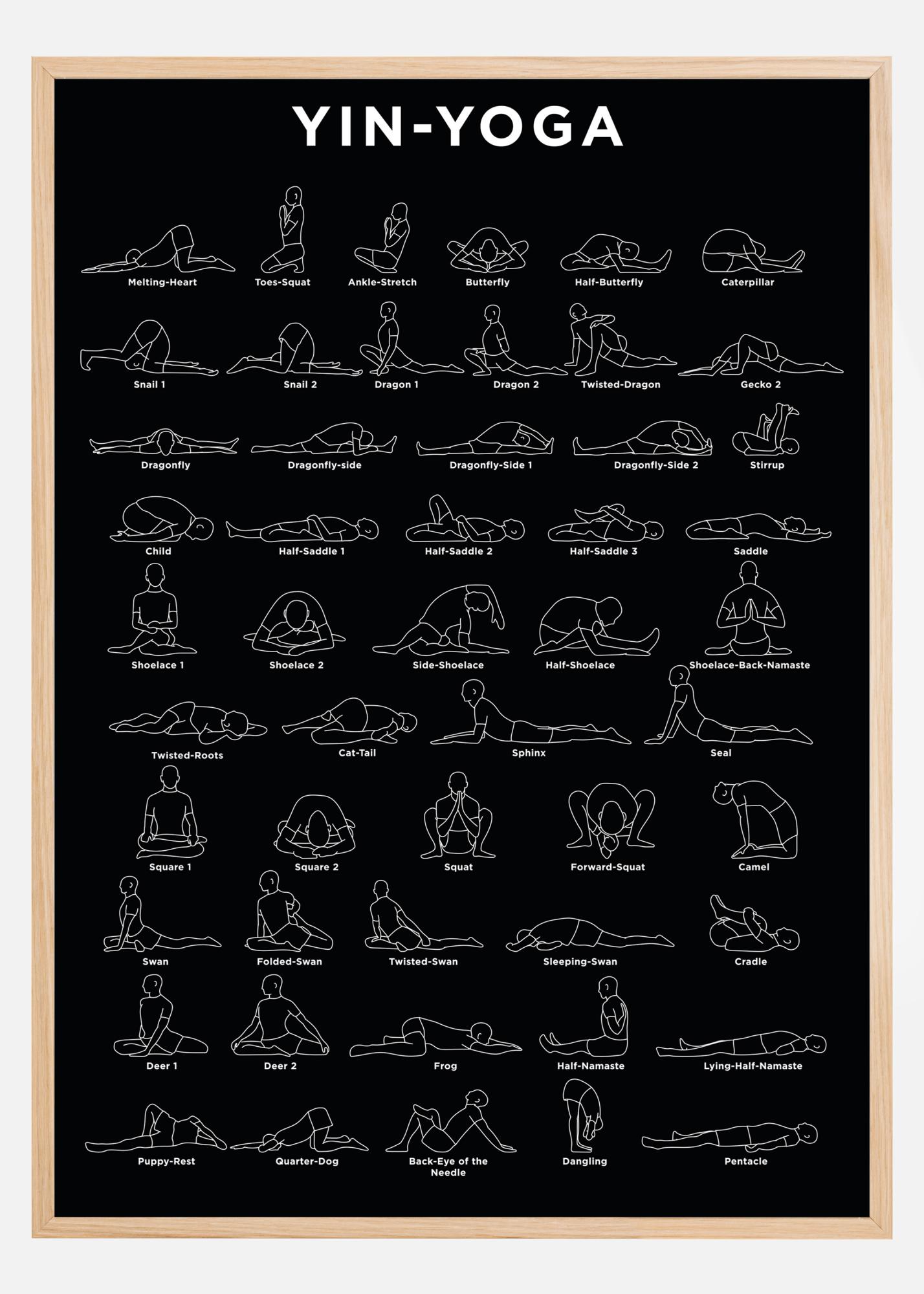 Abivalmis plakat erinevate joogapoosidega, mida saate teha. Vaadake seda musta pilti, kus iga yin-joogapoos on joonistatud lihtsa valge kujutisena. Õppige erinevaid poose kergusega, kui väike figuur näitab, kuidas neid teha. Muutuge paindlikuks sel aastal, kui hakkate venitama tänu sellele prindile!