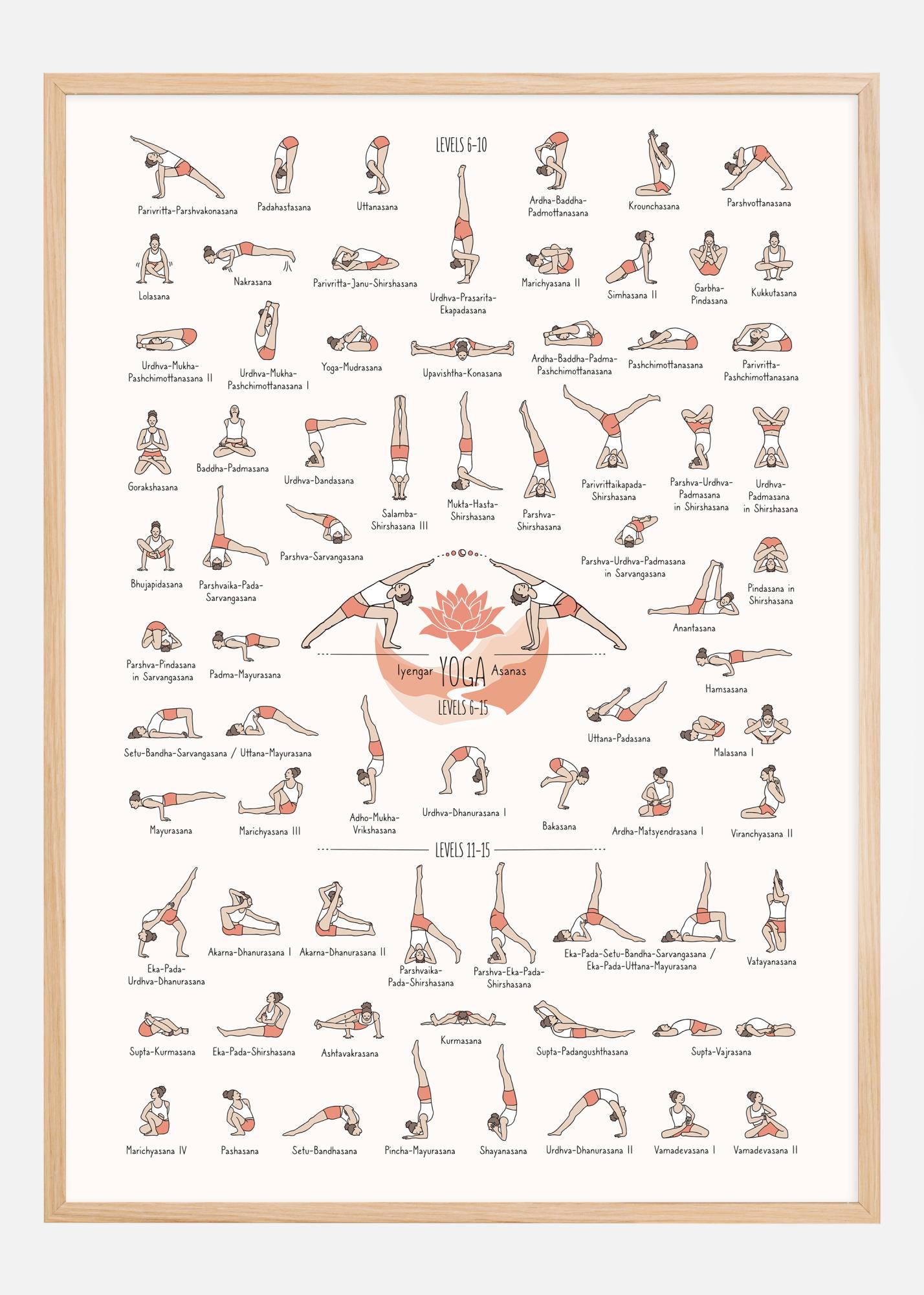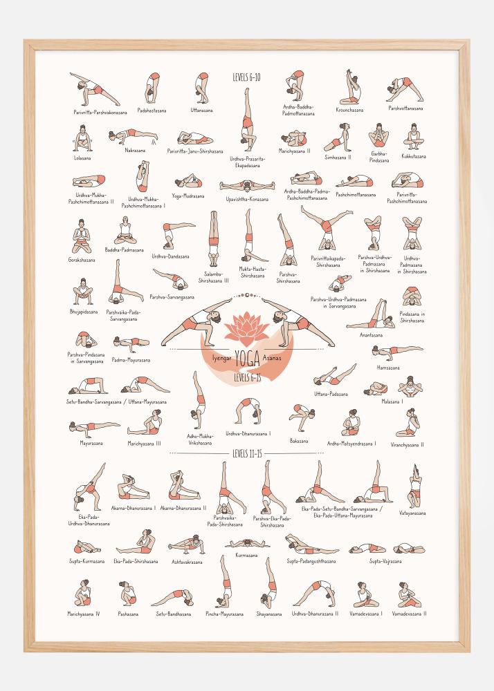 See üksikasjalik ja värvikirev jooga poster illustreerib laia valikut Iyengar jooga asanasid tasemest 6 kuni 15. Iga joogapoos on peenelt illustreeritud sooja, meeldivate värvidega, mis rõhutavad iga vormi ja liigutust, samal ajal kui selgelt tuvastatavad nimed iga illustratsiooni kõrval teevad selle järgimise ja harjutamise lihtsaks. Disain on nii funktsionaalne kui ka esteetiline, luues kutsuva atmosfääri kõikidele joogaharrastajatele, olenemata nende oskustasemest.