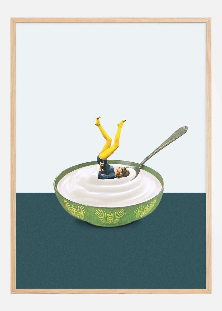 See ainulaadne ja mänguline poster esitleb humoorikat pilti inimesest, kes sooritab jooga-poosi kausis jogurti sees, komplektis paar mänguliselt kollast pükse, mis sobivad ülespoole suunatud asendiga. Loominguline pilt ühendab sürrealismi ja igapäevase huumori elemente ning pakub värskendavat kõrvalekallet traditsioonilisest kunstist ja dekoratsioonist. Kahetooniline taust aitab esile tuua ebatavalise kompositsiooni ja muudab selle vestluse alustajaks.