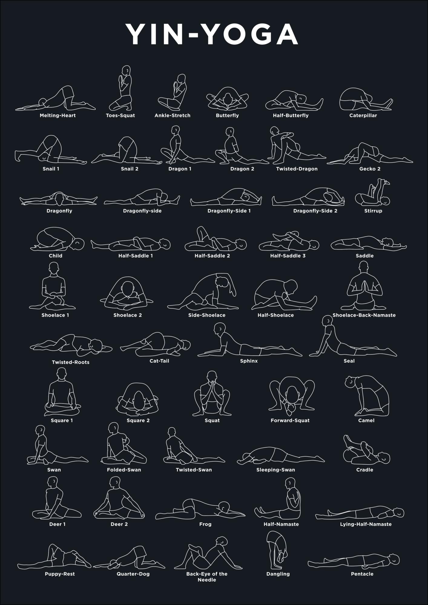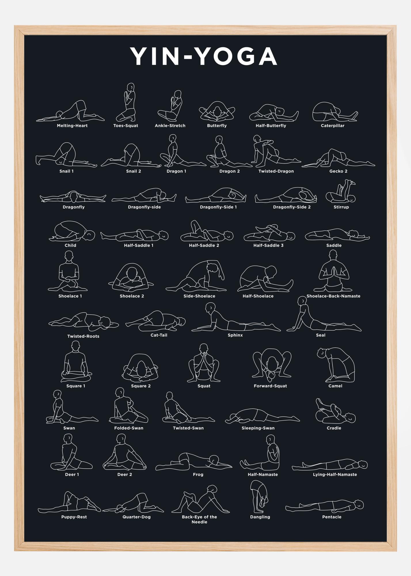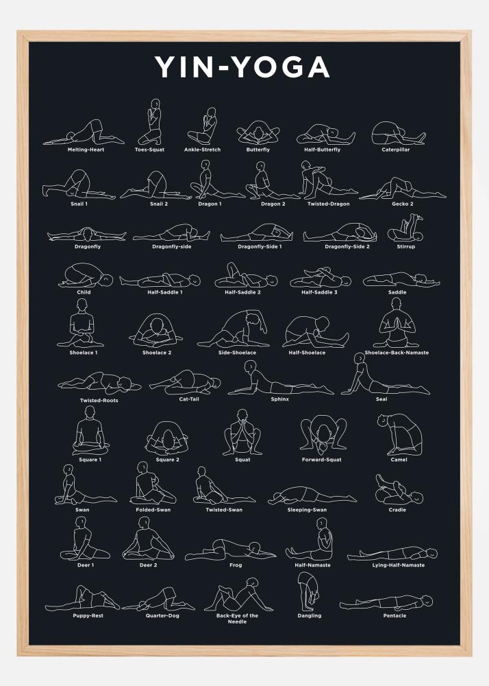 Kasulik plakat erinevate joogapoosidega. Valged figuurid on joonistatud erinevates asendites lihtsal tumesinisel taustal, koos all oleva poosi nimega. Ole valmis maksimaalselt venima, kui riputad selle seinale, et motiveerida ennast.